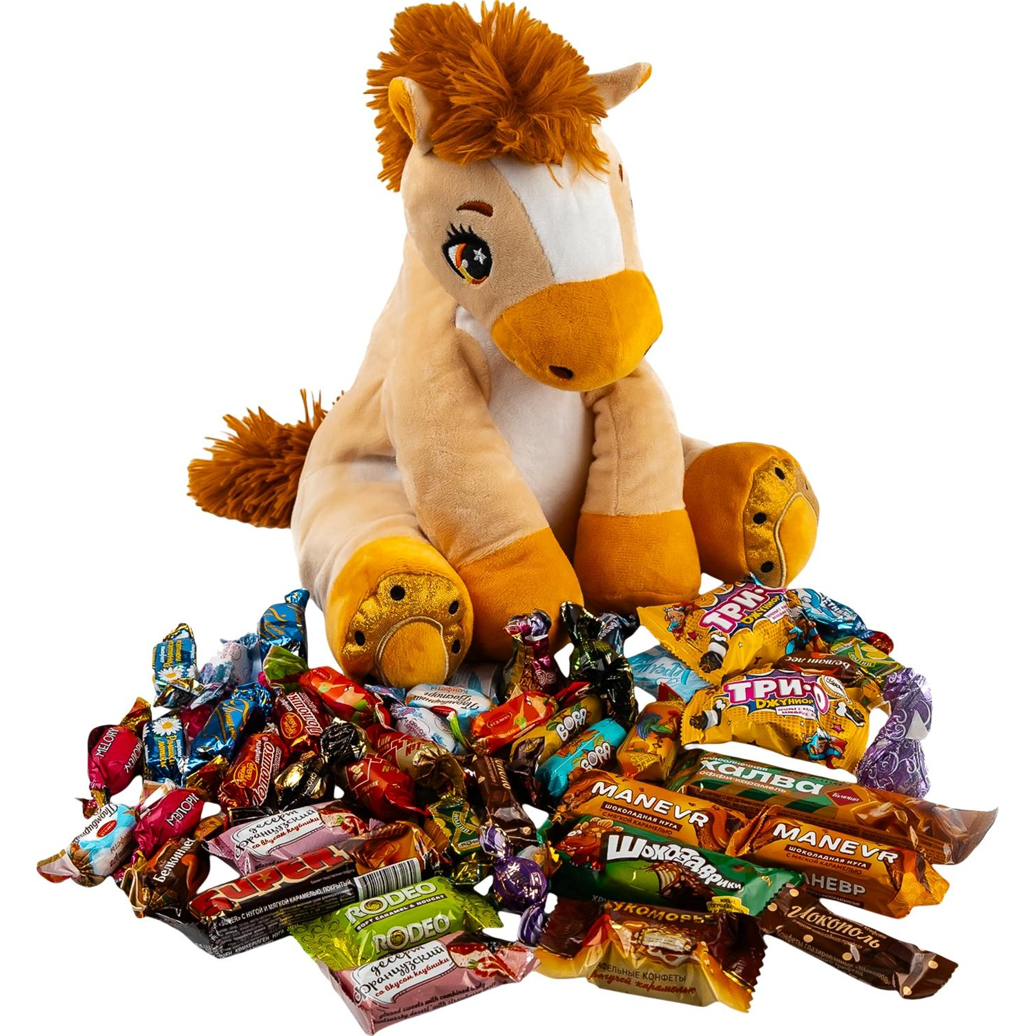 Новогодний сладкий подарок в мягкой игрушке «Счастливчик» — очаровательная лошадка, которая принесёт много радости и подарит своему обладателю минуты нежных объятий и приятных воспоминаний, став верным другом и спутником любого ребёнка. Внутри — приятный сюрприз из замечательных сладостей от лучших российских кондитеров!