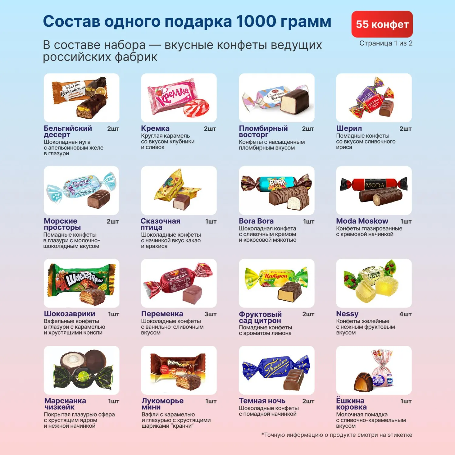 Внимание! Состав конфет в наборе может быть заменён на аналогичные позиции, в случае отсутствия у фабрики указанной конфеты на момент фасовки набора. Замена конфеты происходит с сохранением категории, ценового сегмента и вкусовых характеристик.