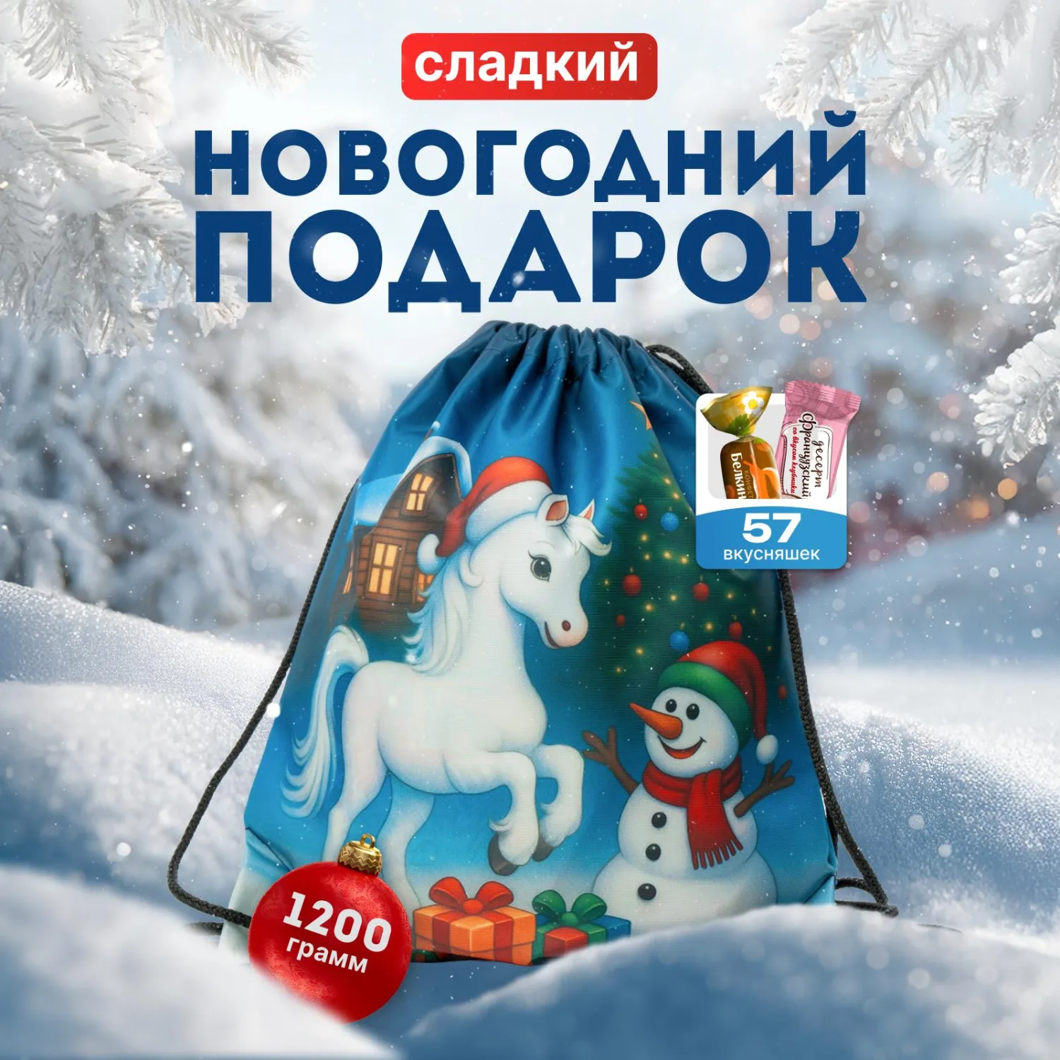 Новогодний сладкий подарок «Снежок-прыгун» — удобный мешок для обуви с новогодним дизайном — стильная и практичная упаковка для сладкого подарка! После праздников мешок можно использовать по прямому назначению — для хранения обуви или других вещей.