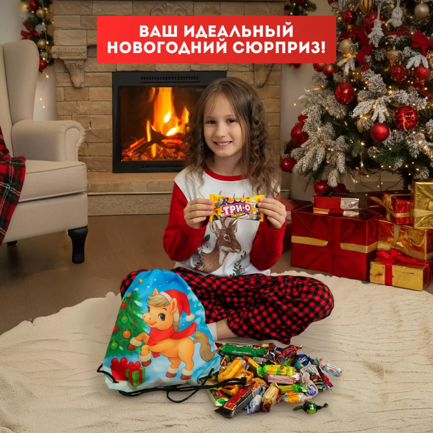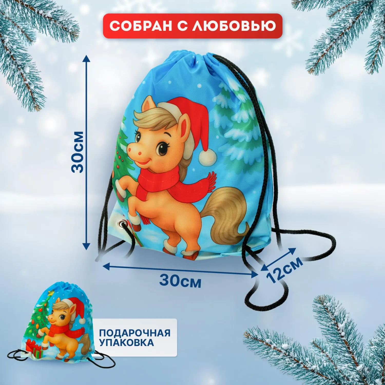 Новогодний сладкий подарок «Зимняя забава» — практичный и праздничный мешок для обуви идеальная упаковка для новогоднего сладкого подарка! Мешок с ярким новогодним дизайном удобно использовать и после праздников для хранения обуви или других мелочей.