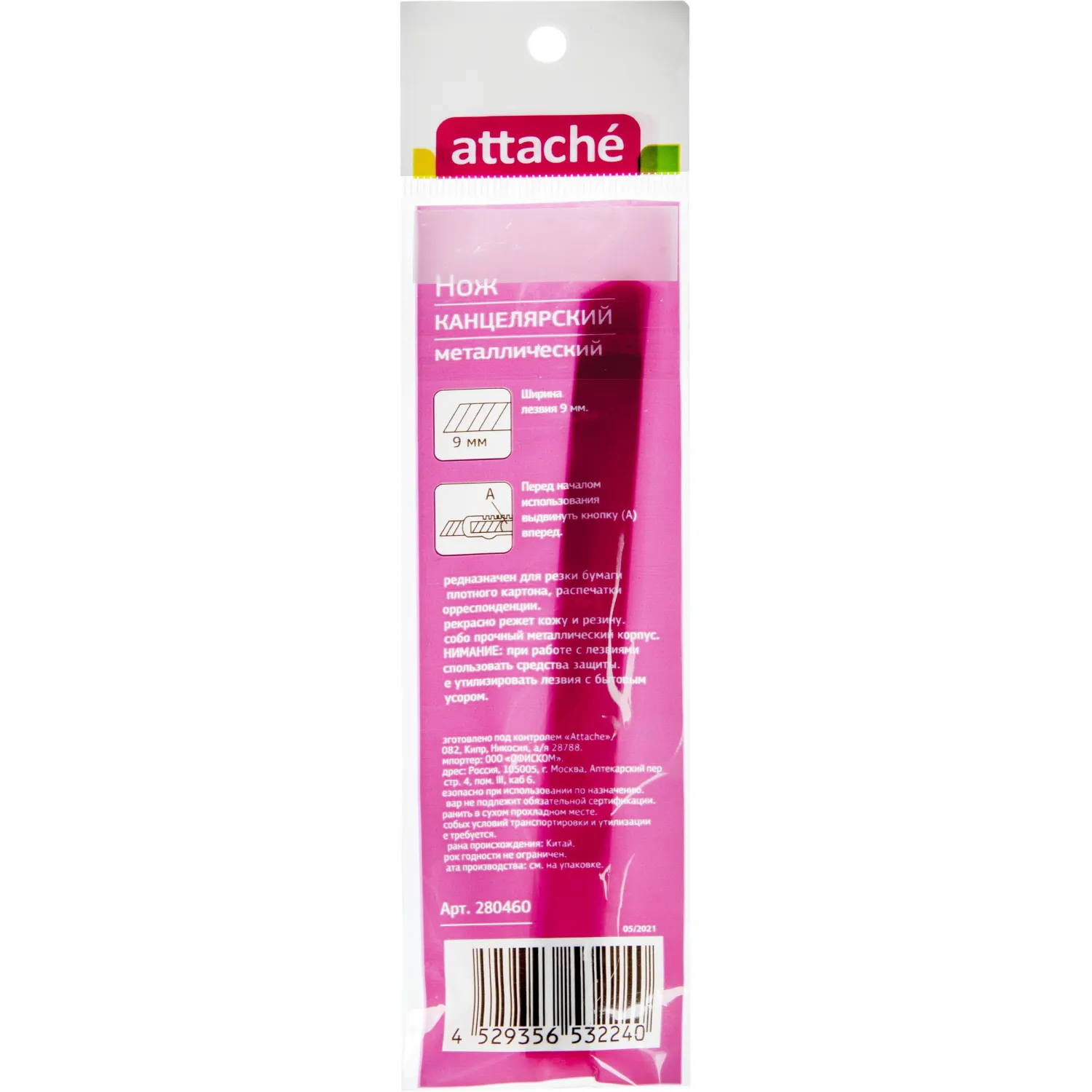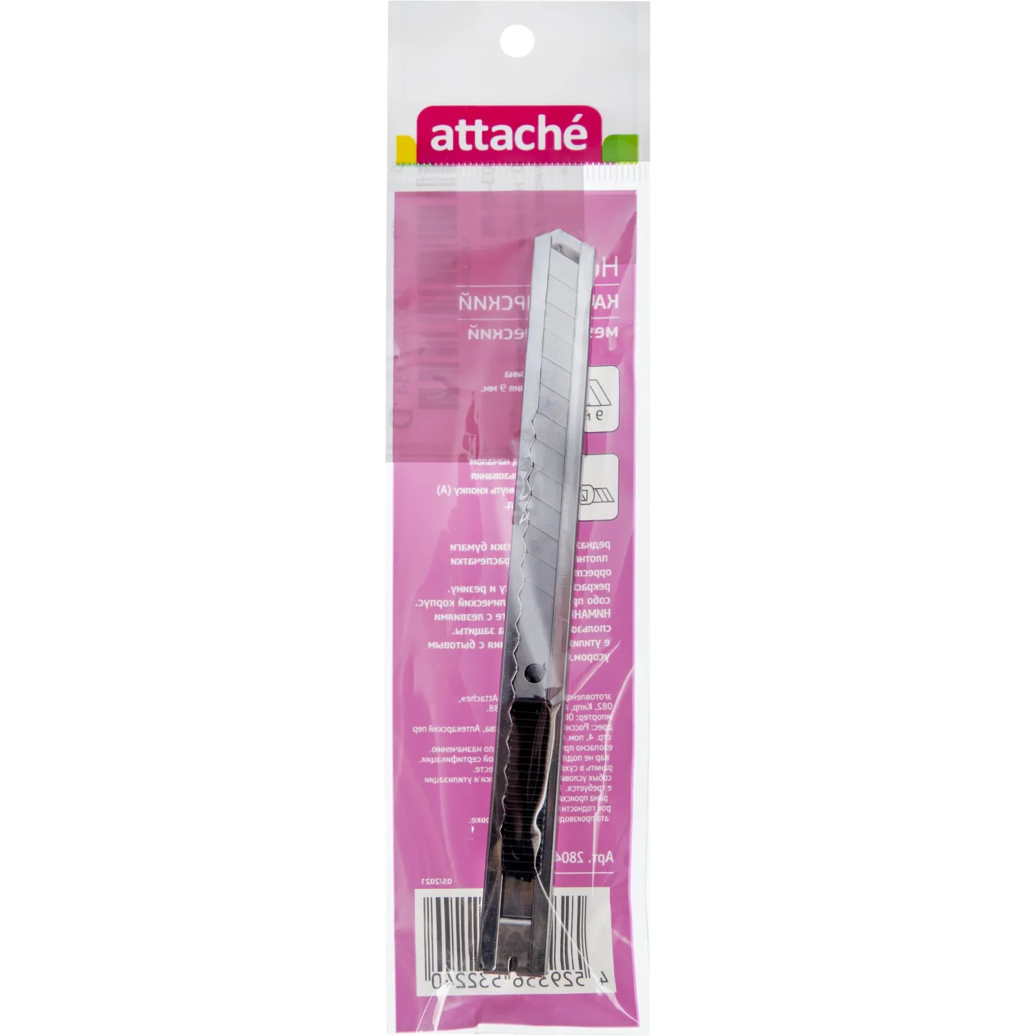 Нож канцелярский Attache с сегментированным отламывающимся лезвием. Используется для резки широкого спектра материалов: напольных покрытий, ткани, бумаги, кожи, плёнки и т. п. Металлическая направляющая из нержавеющей стали обеспечивает надёжную фиксацию лезвия в момент использования.