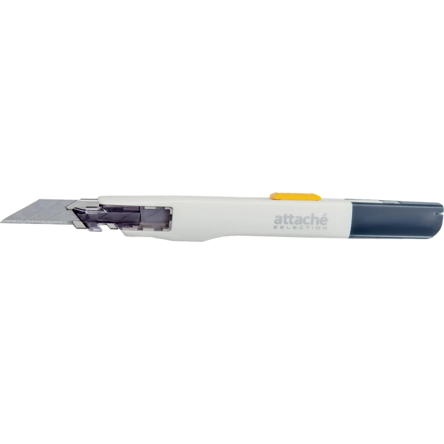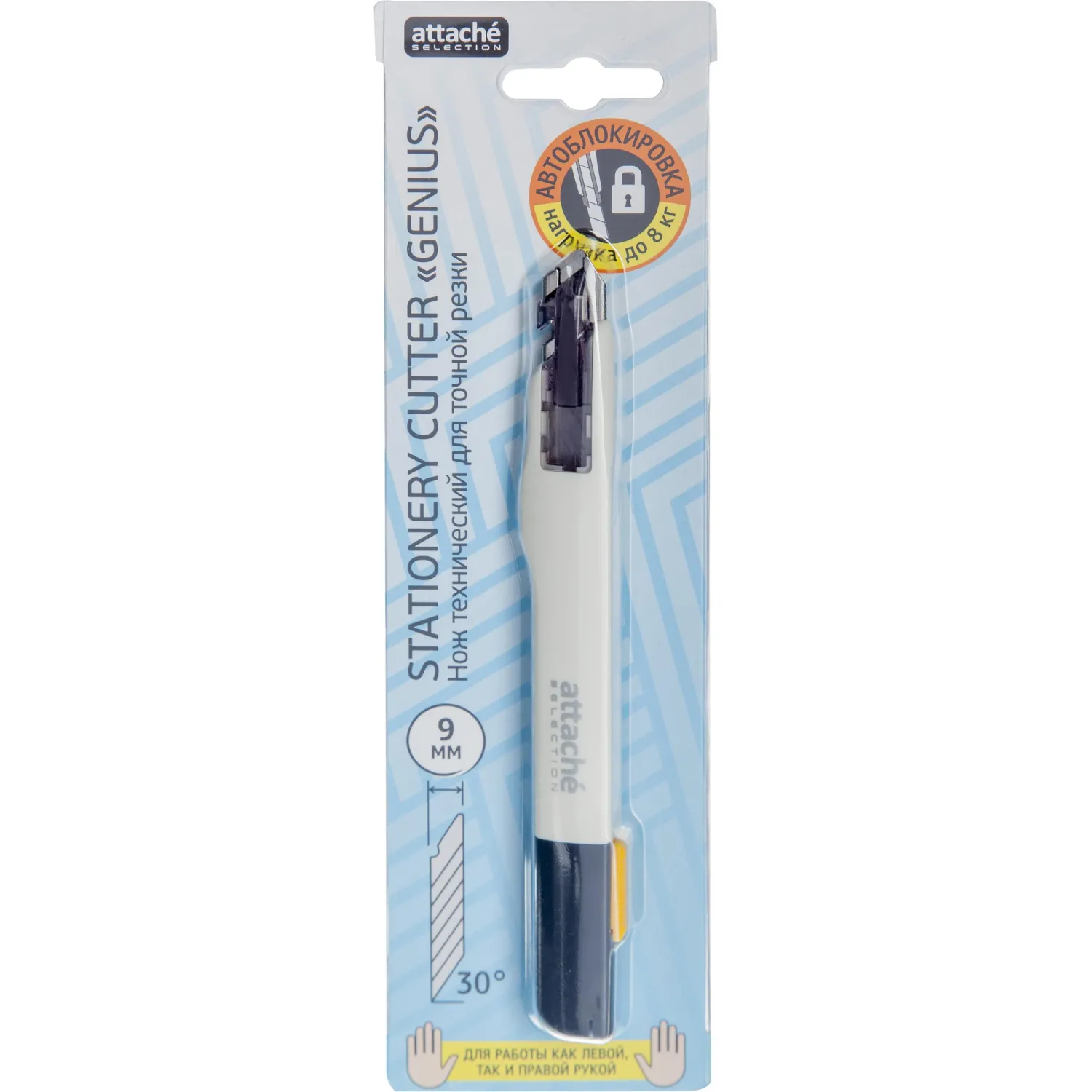 Нож канцелярский Attache Selection Genius. Активно используется в канцелярии, а также для ремонтных работ, не требующих приложения больших усилий. Дизайн корпуса рассчитан для комфортного использования как левшами, так и правшами. Металлическая направляющая из нержавеющей стали обеспечивает надежную фиксацию лезвия в момент использования.