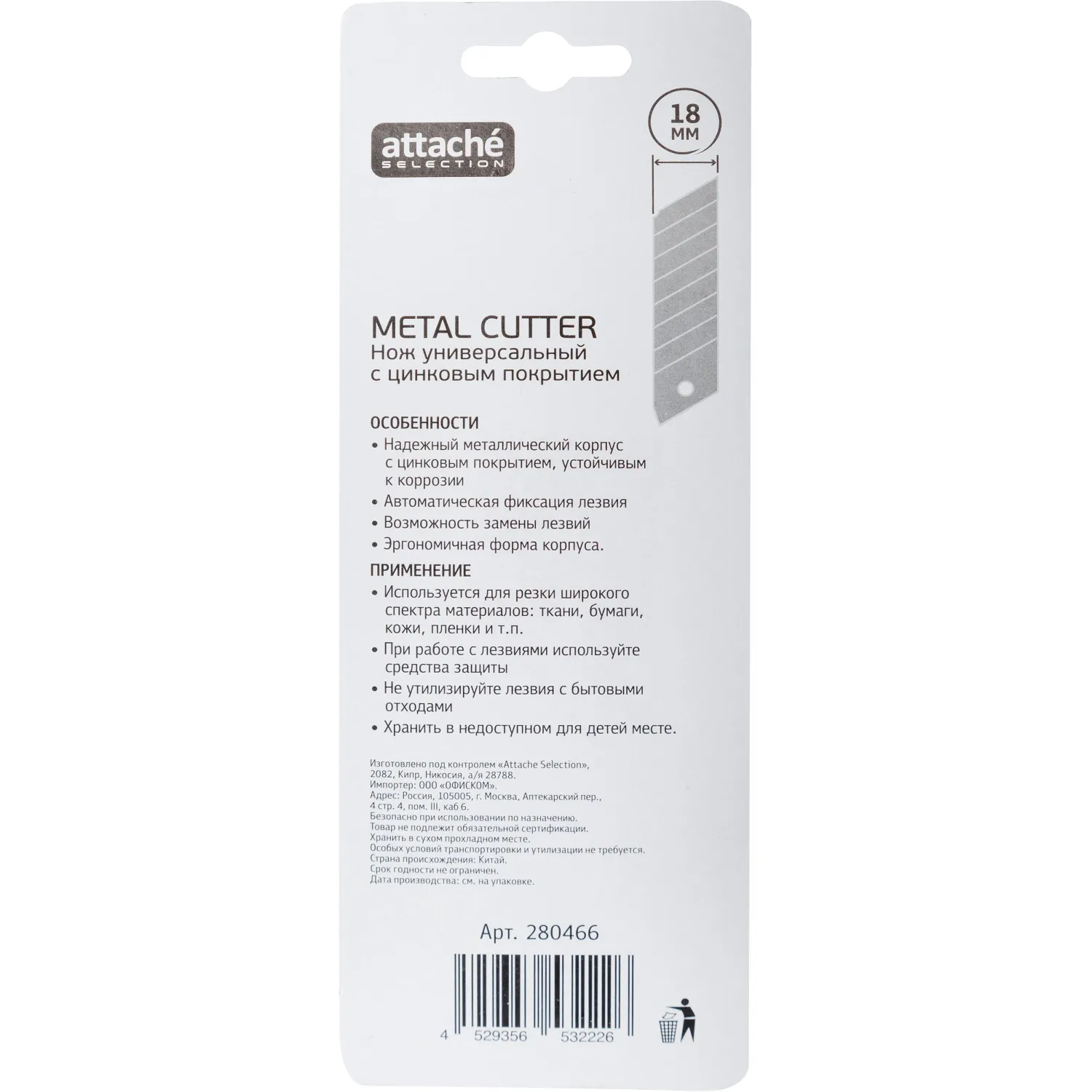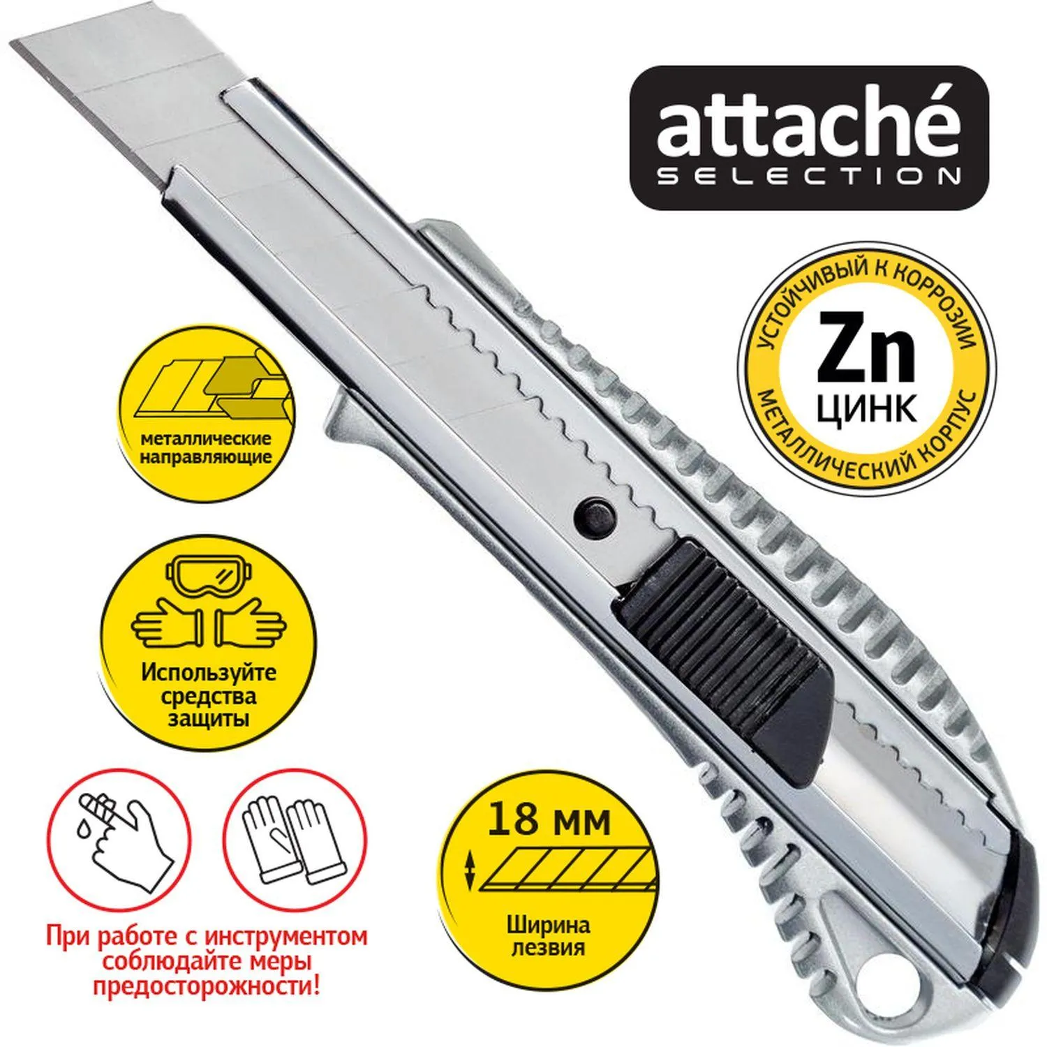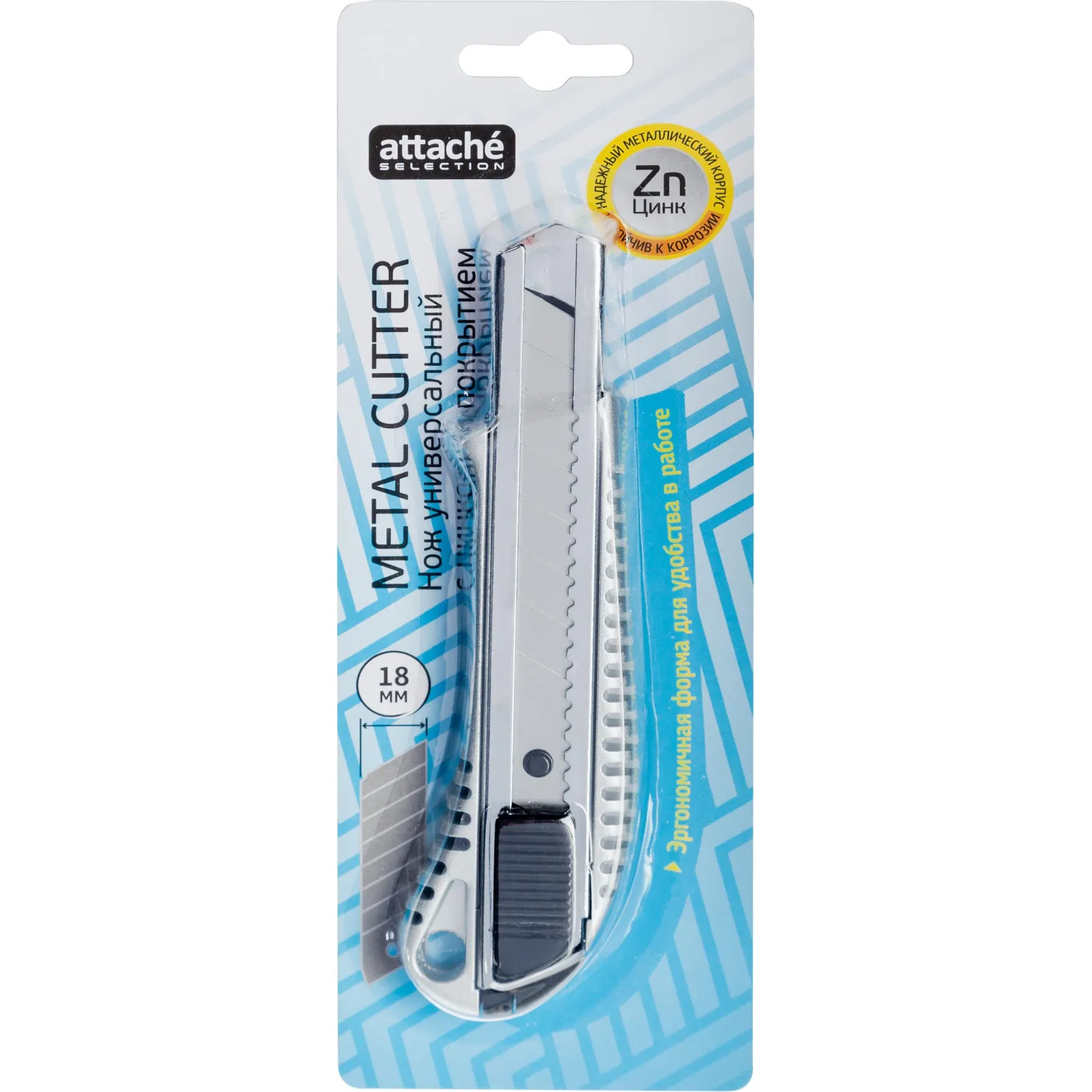 Нож универсальный Attache Selection с цинковым покрытием ширина лезвия 18 мм. Нож универсальный Attache Selection с сегментированным отламывающимся лезвием. Подходит для резки бумаги, плёнки, ленты стрейч, кожи, для складских работ, а также для проведения ремонтных работ, не требующих приложения больших усилий. Эргономичный, надёжный корпус с пластиковыми вставками с рифлением. Металлическая направляющая из нержавеющей стали обеспечивает надёжную фиксацию лезвия в момент использования.
