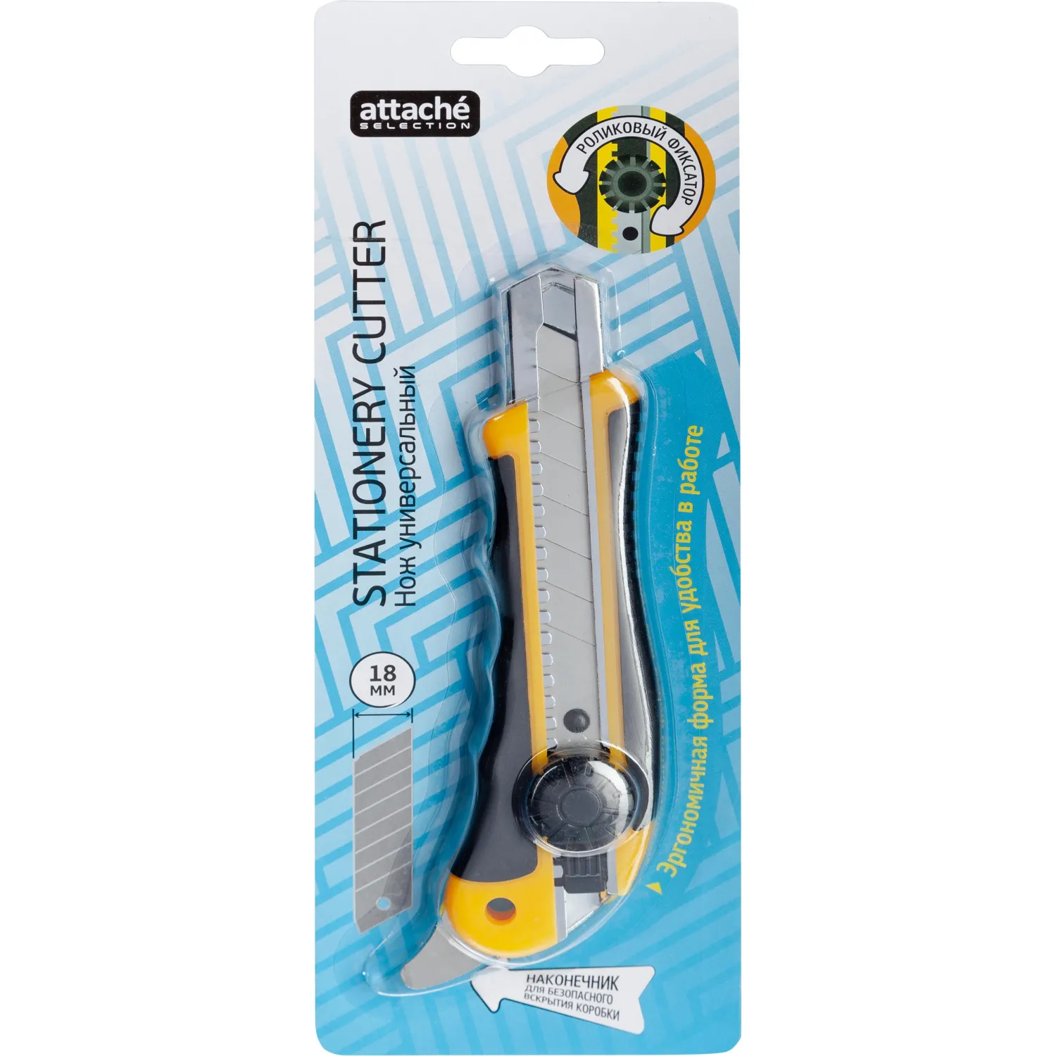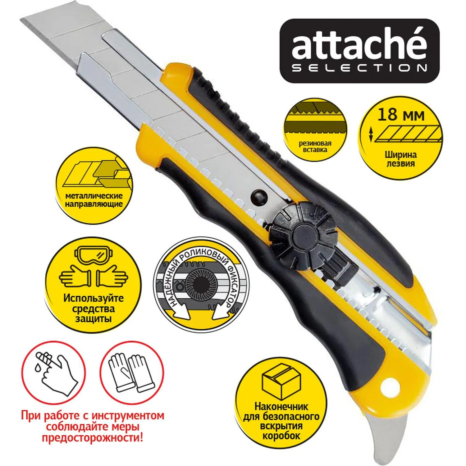 Нож универсальный Attache Selection ширина лезвия 18 мм. Нож канцелярский Attache Selection с прорезиненными вставками. Используется для резки бумаги, плотного картона, распечатки корреспонденции и посылок. Эргономичная рукоятка с резиновыми вставками контрастного цвета для увеличения противоскользящих свойств. Металлические направляющие для лезвия увеличивают прочность ножа, создают дополнительную жесткость при разрезании плотных материалов.