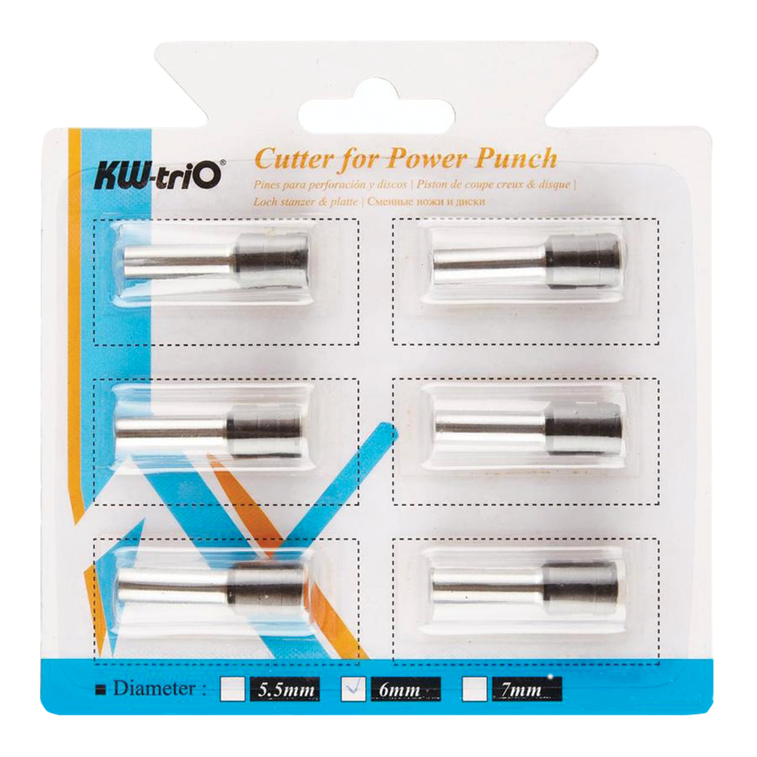 Комплект сменных ножей для мощных дыроколов KW-trio моделей 952/954/931D (артикулы 4105 и 17999). Диаметр ножа — 6 мм. Длина изделия — 2.7 см. Длина лезвия — 1.6 см. Ножи изготовлены из стали, поставляются в блистерной упаковке с европодвесом. В комплекте 6 ножей. Совместимы с дыроколами под артикулами 4105 и 17999. Внимание! Ножи являются расходным материалом. Срок службы ножа напрямую зависит от частоты и интенсивности использования дырокола, а также от плотности пробиваемого материала, и может составлять от месяца до года. Каналы внутри полых ножей забиваются бумажными отходами по мере эксплуатации дырокола. В случае, если это произошло, снимите ножи согласно инструкции к дыроколу и небольшим острым инструментом вычистите бумагу из каналов. Следите, чтобы режущая кромка не повредилась. В случае износа или повреждения ножей их необходимо заменить. Инструкцию по замене и установке сменных ножей см. в Инструкции по эксплуатации во вкладке «Описание» совместимых дыроколов.