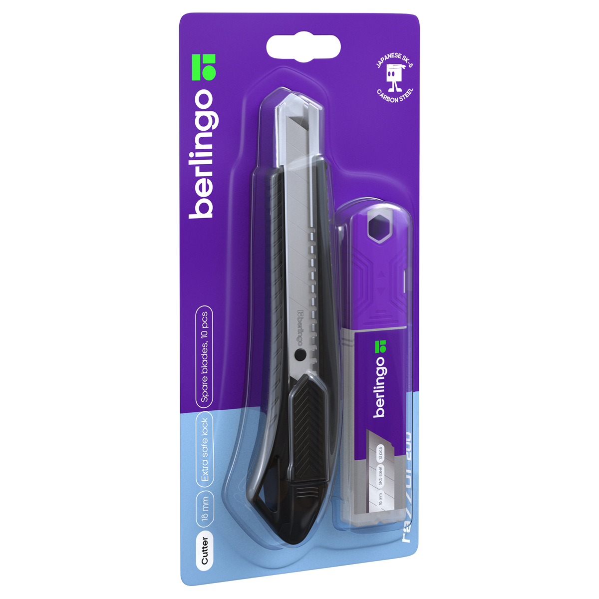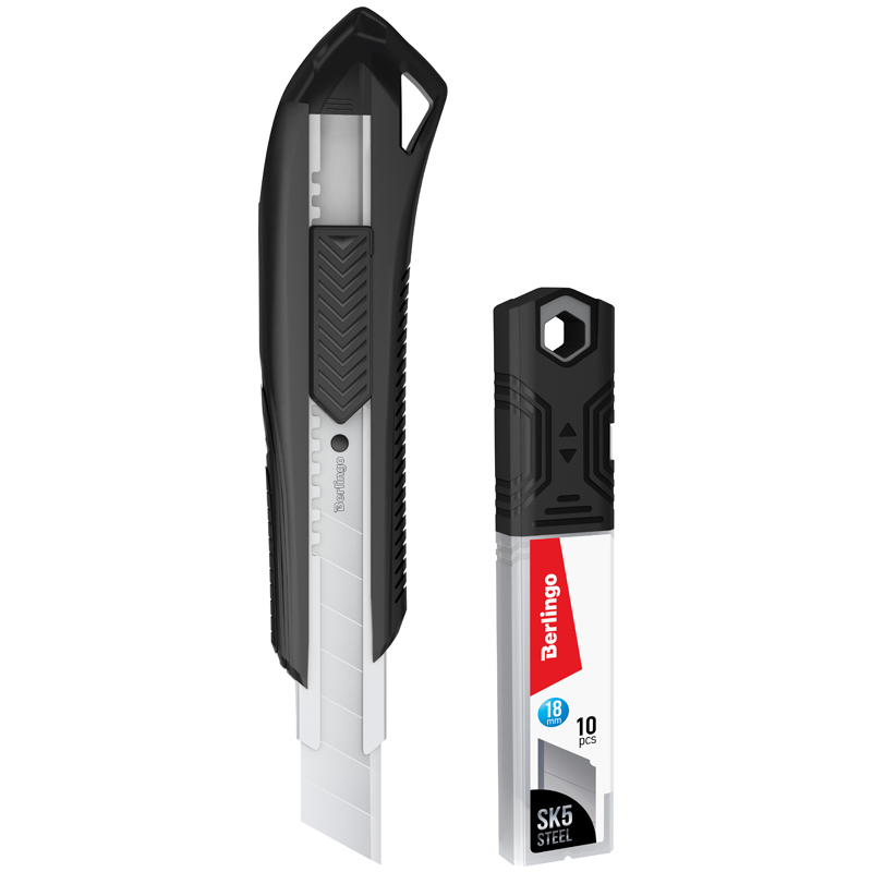 Нож канцелярский 18мм Berlingo "Razzor 200", черный + лезвия сменные 10шт., блистер, европодвес