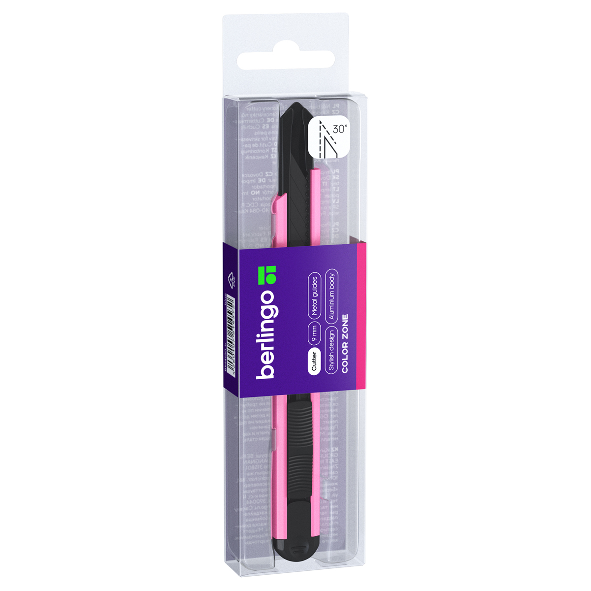 Нож канцелярский 9мм Berlingo "Color Zone", черное лезвие, auto-lock, металл. направл., розовый, европодвес