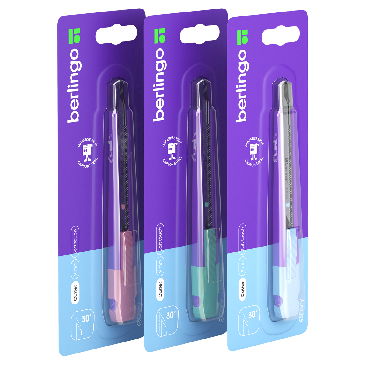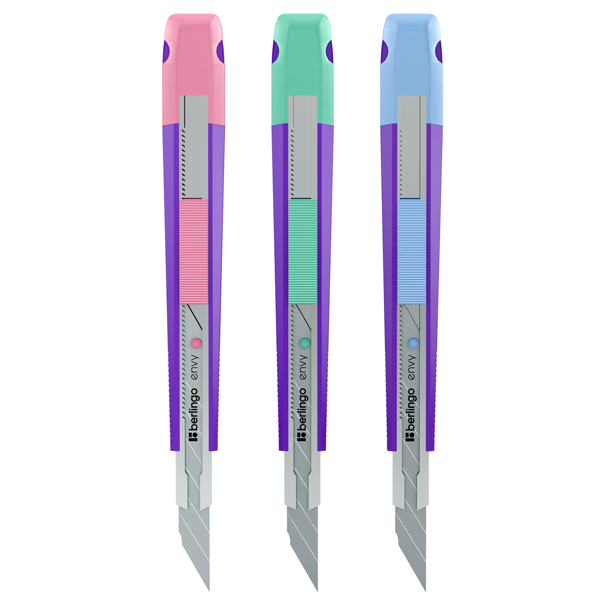 Канцелярский нож Berlingo кросс-серии Envy с автоматической системой фиксации лезвия auto-lock. Прочный корпус выполнен из качественного ABS-пластика с тактильно приятным покрытием soft-touch, что обеспечивает дополнительный комфорт при использовании и предотвращает скольжение пальцев. Износостойкое лезвие шириной 9 мм сделано из стали SK5 с углом заточки 30°, который гарантирует чёткость среза. Нож оснащён металлическими направляющими для плавного движения лезвия.