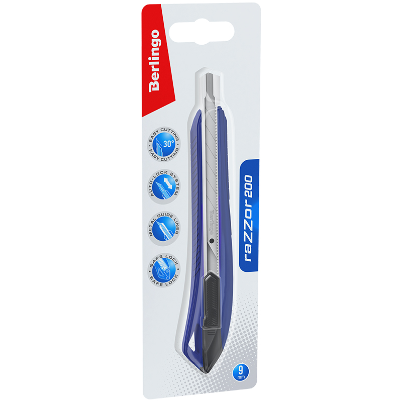 Нож канцелярский 9мм Berlingo "Razzor 200", auto-lock, металл. направл., синий, европодвес