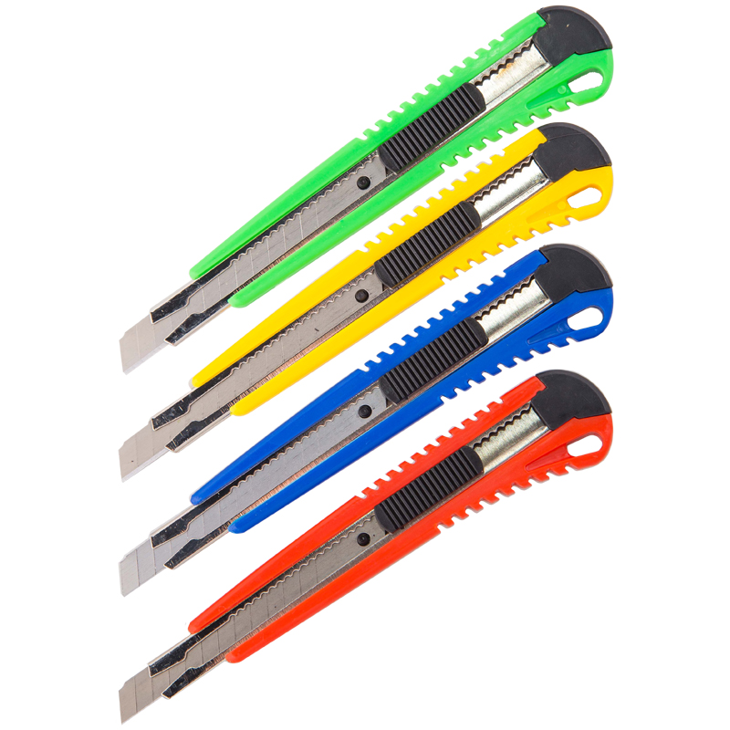 Нож канцелярский 9мм, усиленный, с фиксатором, металлические направляющие. Предназначен для резки различных материалов, в т.ч. особо плотных видов картона.