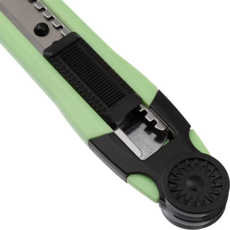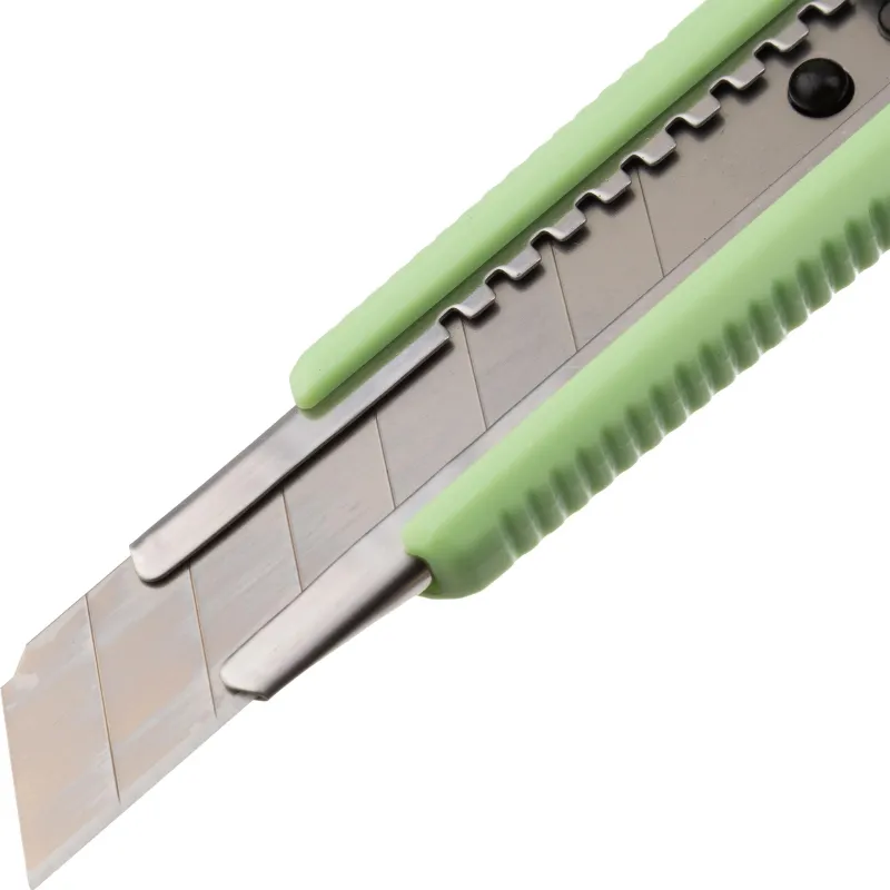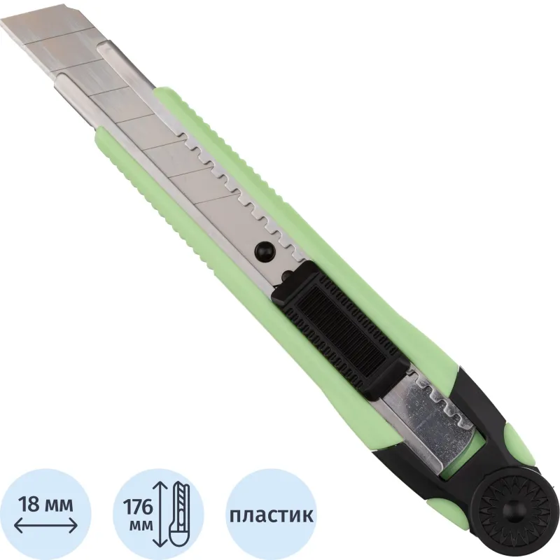 Нож канцелярский для резки бумаги, плотного картона, распечатки корреспонденции и посылок. Эргономичная рукоятка c металлическими направляющими для лезвия увеличивают прочность ножа, создают дополнительную жёсткость при разрезании плотных материалов.