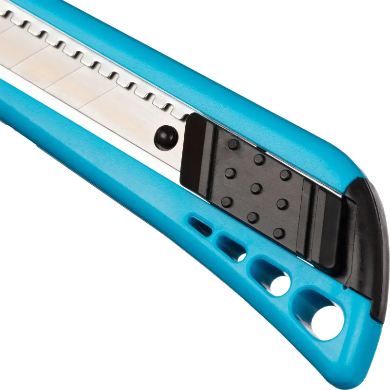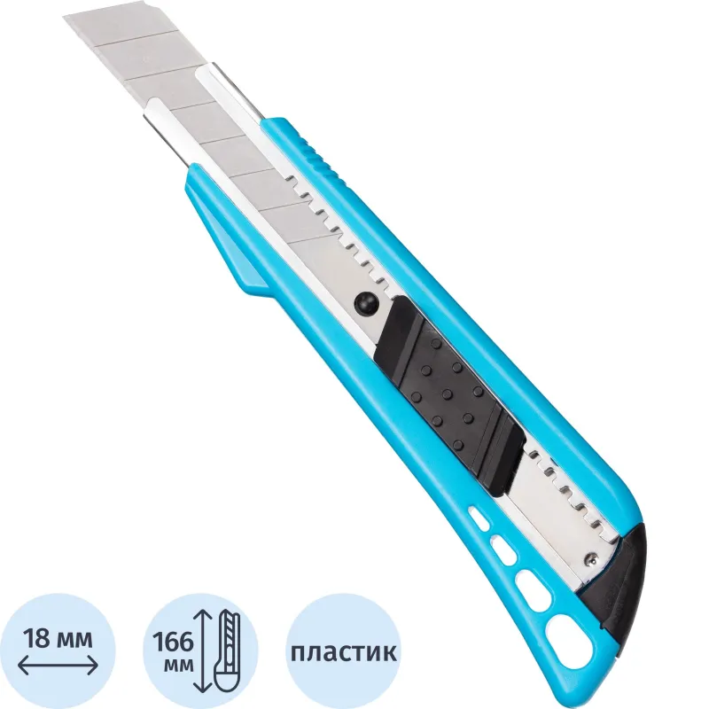Нож канцелярский для резки бумаги, плотного картона, распечатки корреспонденции и посылок. Эргономичная рукоятка c металлическими направляющими для лезвия увеличивают прочность ножа, создают дополнительную жёсткость при разрезании плотных материалов.