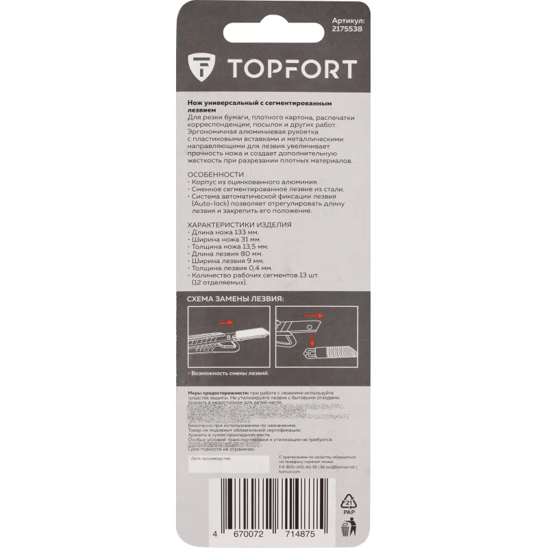 Любые вопросы по товару «Нож универсальный TOPFORT 9 мм алюминиевый мет направл» вы можете задать нашим продавцам по телефонам +7 (495) 215-28-10, 8 (800) 555-3604, электронной почте info@ofsi.ru и в скайпе ofsi.ru.