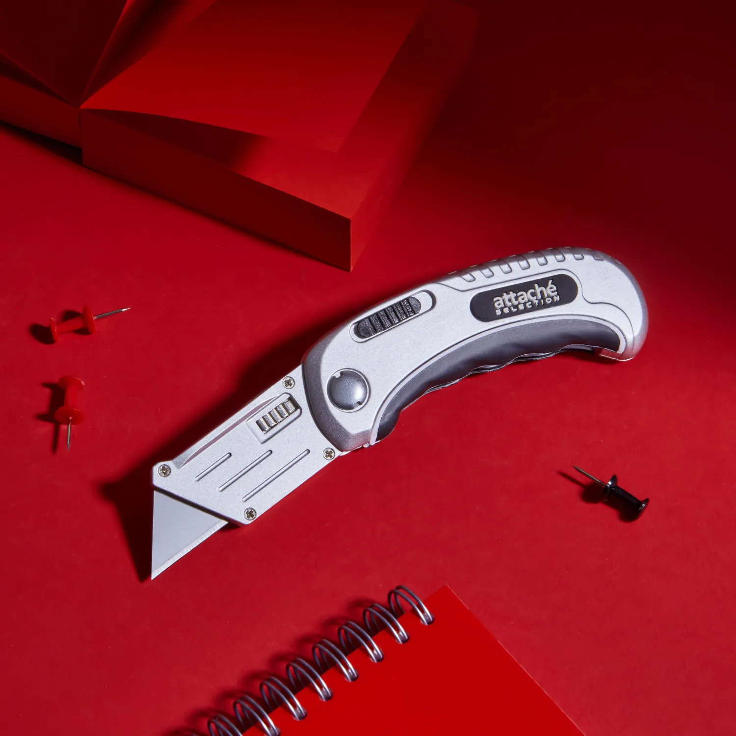 Универсальный многофункциональный нож Attache Selection с трапециевидным лезвием предназначен для резки различных материалов, таких как ткань, бумага, кожа и плёнка. Эргономичный и надёжный корпус ножа выполнен из термопластичного каучука (TPR) и ударопрочного ABS-пластика, что предотвращает соскальзывание пальцев и обеспечивает удобство в работе.