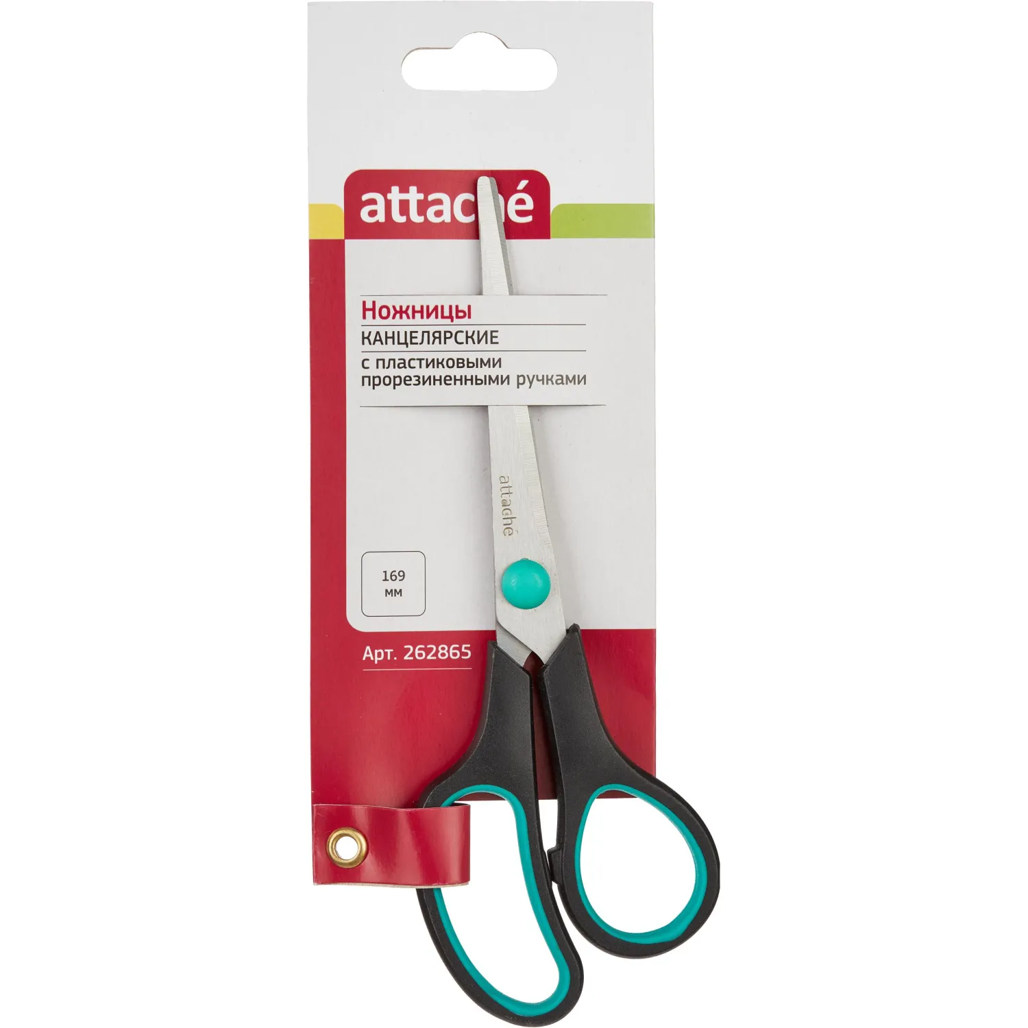 Канцелярские ножницы (офисные) Attache эргономичного дизайна, изготовленные из стали. Пластиковые ручки чёрного цвета имеют анатомическую форму для естественного положения инструмента в руке. Прорезиненные манжеты предотвращают скольжение пальцев. Трёхсторонняя заточка лезвий.