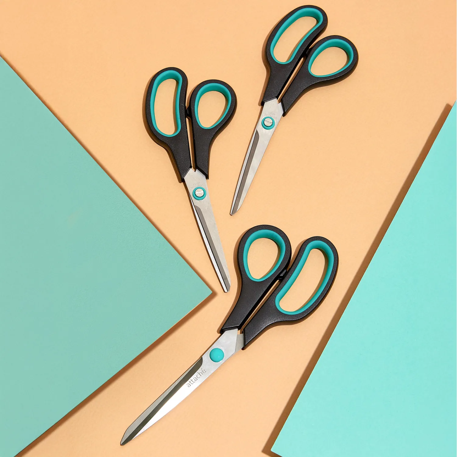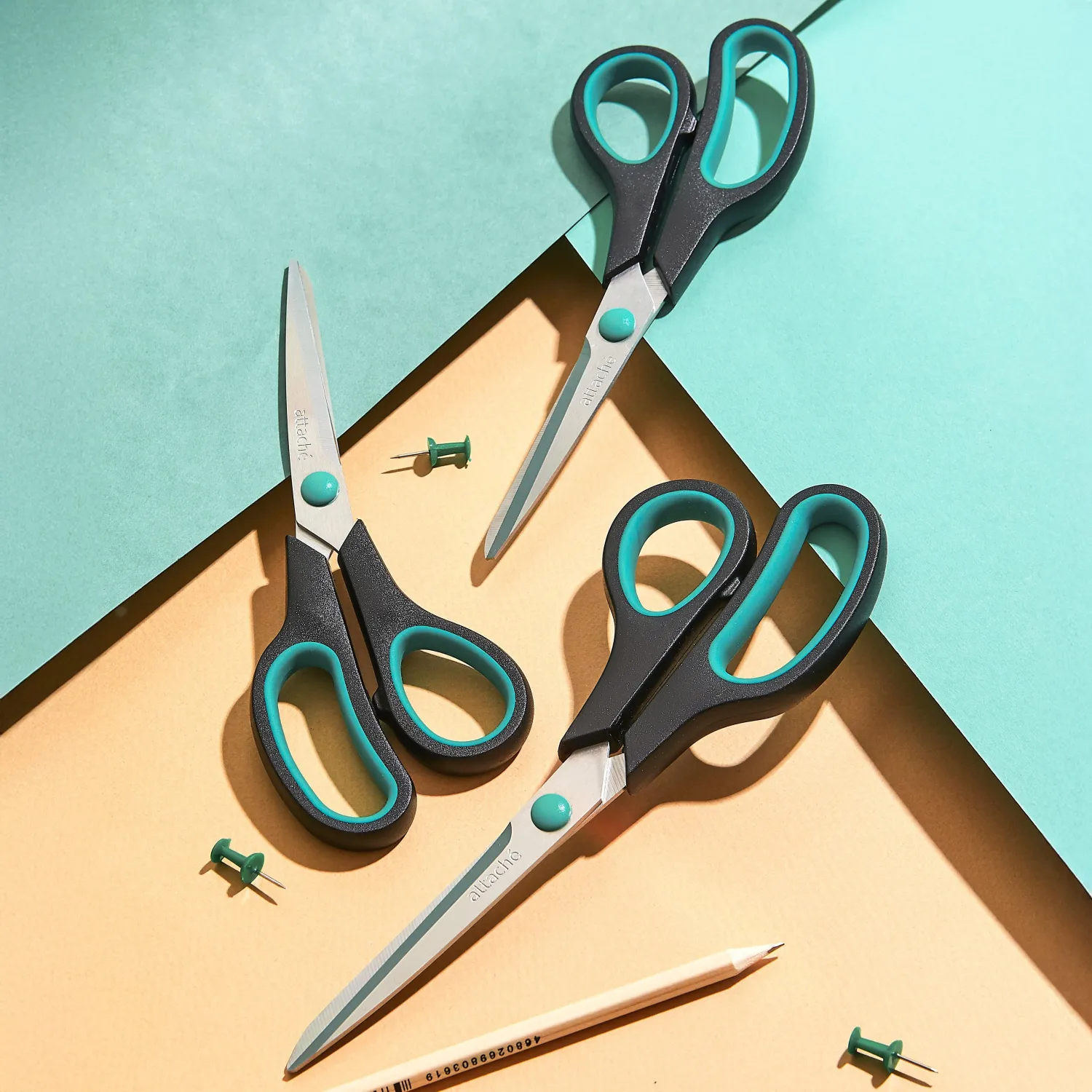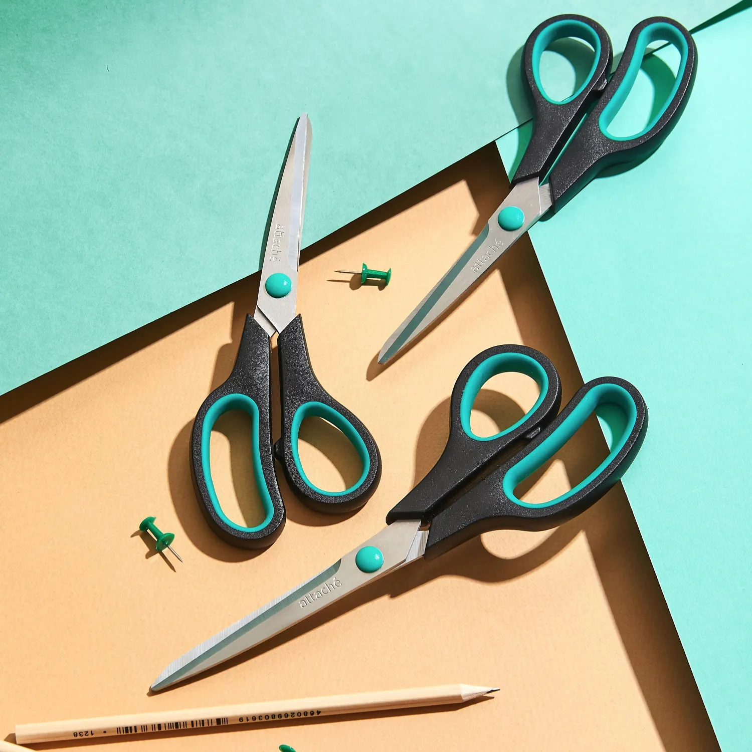 О товаре «Ножницы 215 мм Attache с пластиковыми прорезиненными анатомическими ручками черного/зеленого цвета»