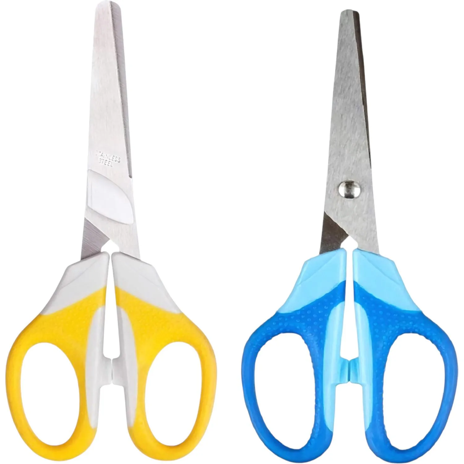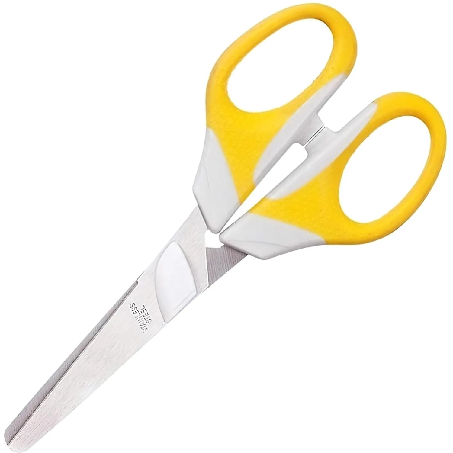 Лезвия у ножниц выполнены из высококачественной нержавеющей стали с закруглённым концом для повышенной безопасности. Симметричные кольца синего цвета с резиновыми вставками предотвращают скольжение пальцев. Фиксатор отсутствует. Ножницы представлены на картонной подложке с европодвесом.