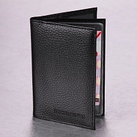 Обложка для паспорта выполнена из ПВХ, с картоном внутри. На обложке тиснение золотой фольгой герба России и слов «Россия», «Паспорт». Внутри серебристая