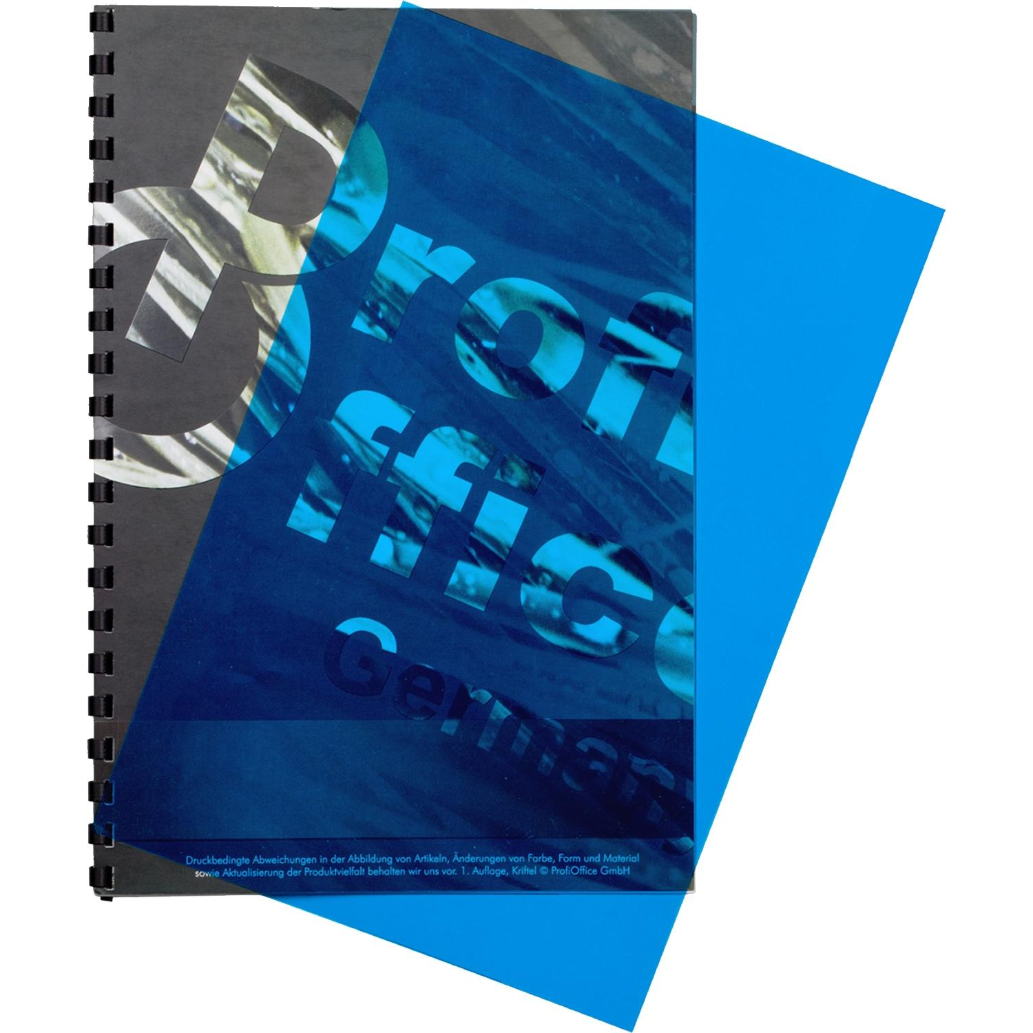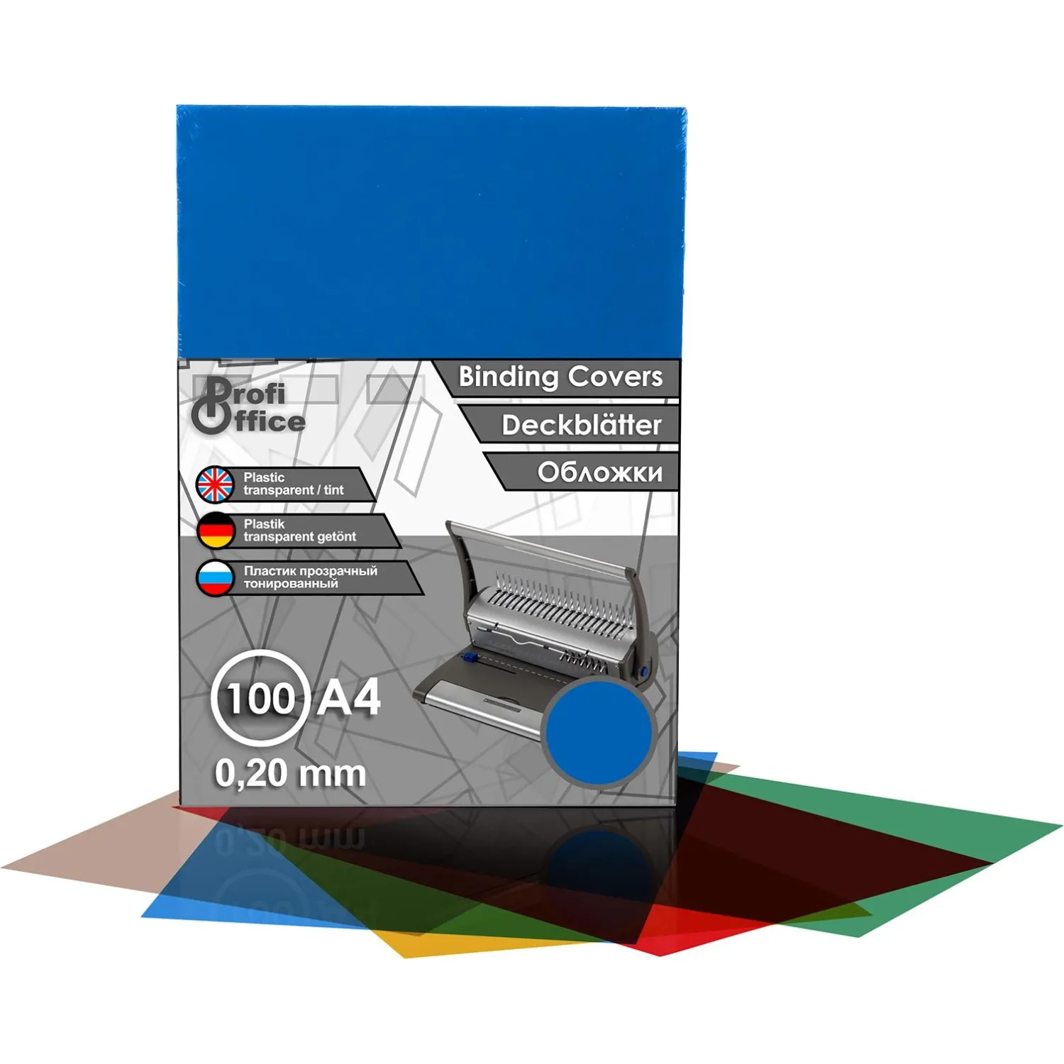Пластиковые обложки для переплета ProfiOffice А4 формата, прозрачные, тонированные синие. Предназначены для переплета документов брошюровщиком с помощью пластиковых и металлических пружин.