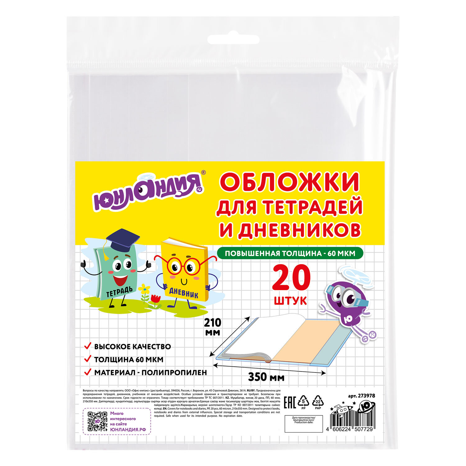 О товаре «Обложки ПП для тетрадей и дневников, КОМПЛЕКТ 20 шт., 60 мкм, 210х350 мм, ЮНЛАНДИЯ, 273978»