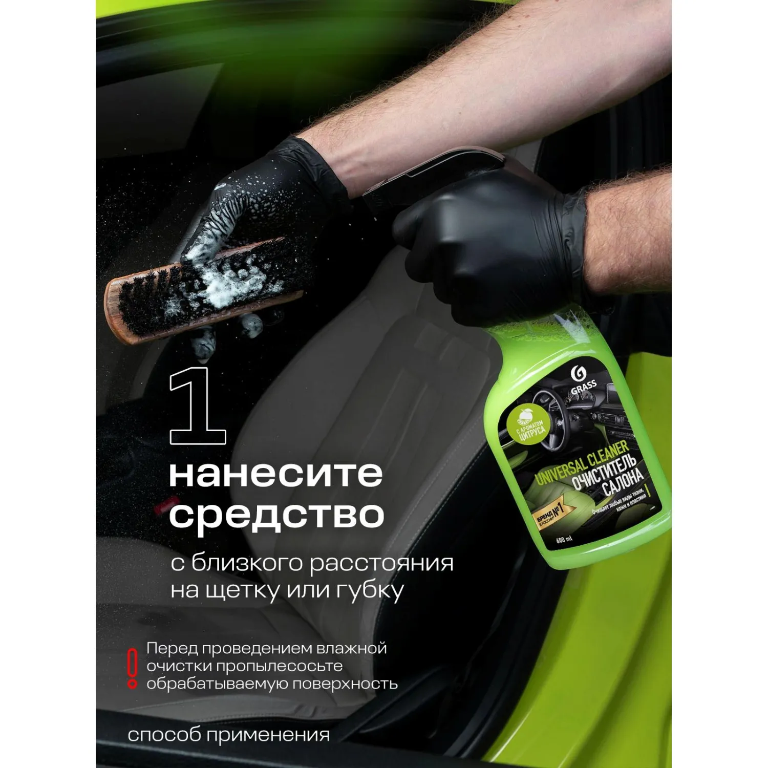 Способ применения: перед проведением влажной очистки желательно пропылесосить обрабатываемую поверхность. Нанести средство из распылителя с близкого расстояния, щёткой или губкой взбить пену. Пенный раствор вместе с пылью и загрязнениями собрать с помощью пылеводососа или вручную.