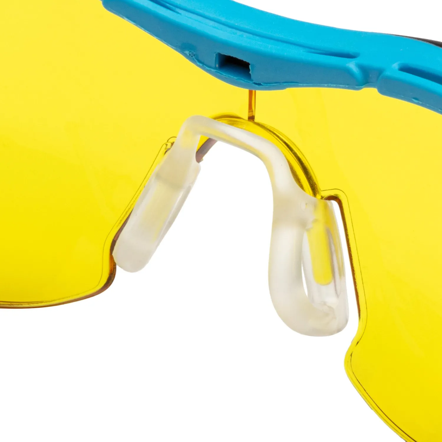 Увеличенная защита от попадания механических частиц и жидкостей сверху и сбоку. Мягкие заушники, регулируемые по длине и углу наклона, позволяют адаптировать очки под индивидуальные требования пользователя. Мягкие носоупоры обладают противоскользящим действием. Вставка Evoprene в верхней части оправы — защита от пыли, пота и переохлаждения.