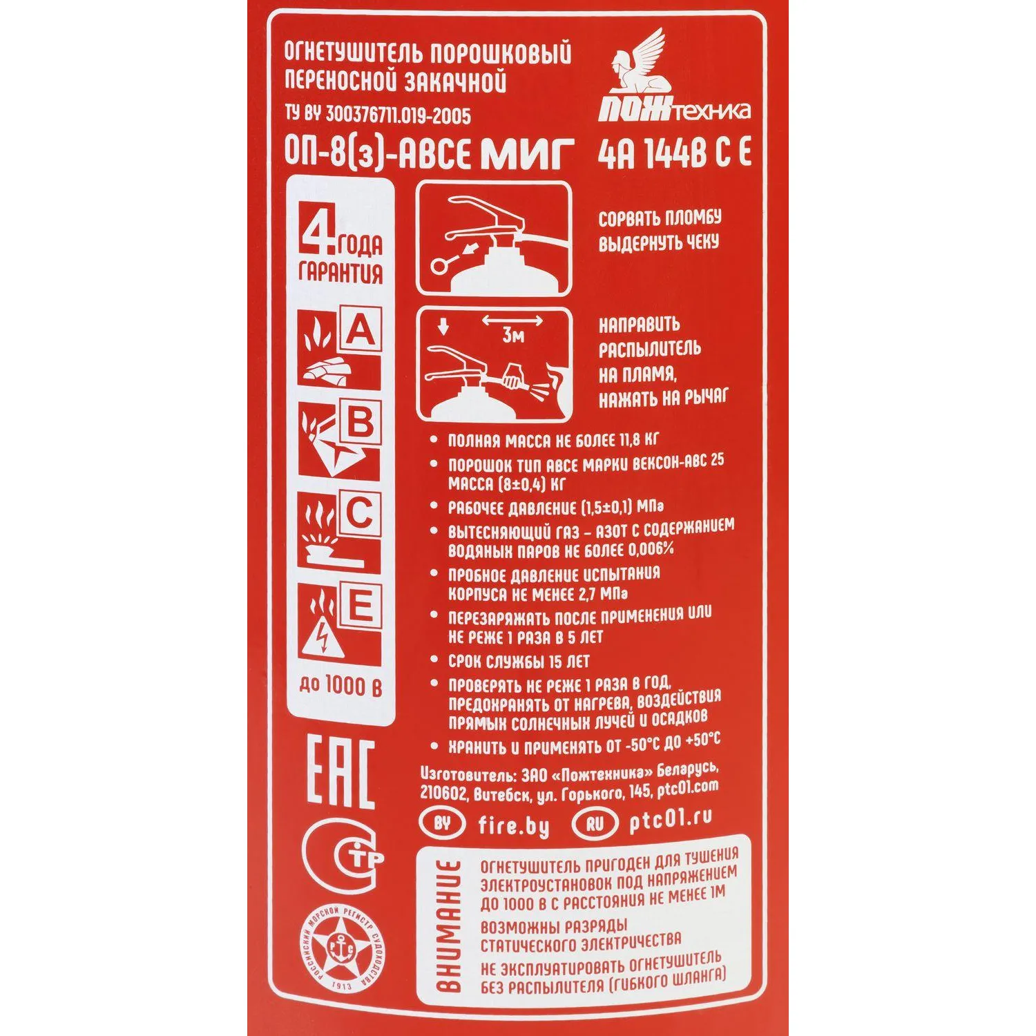 О товаре «Огнетушитель порошковый Пожтехника ОП-8(з) Миг (АВСЕ, 4А 144В СЕ, ЗПУ-стеклонаполненный полиамид, 111-11)»