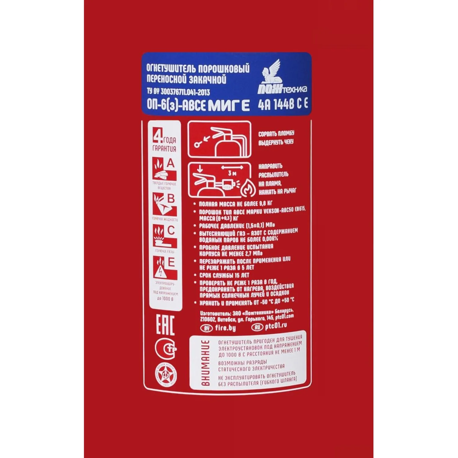 Тип огнетушителя по принципу создания давления: закачной. Огнетушащая способность по тушению модельных очагов пожара классов А и В составляет 4А и 144В соответственно. Производитель: Пожтехника (Беларусь).