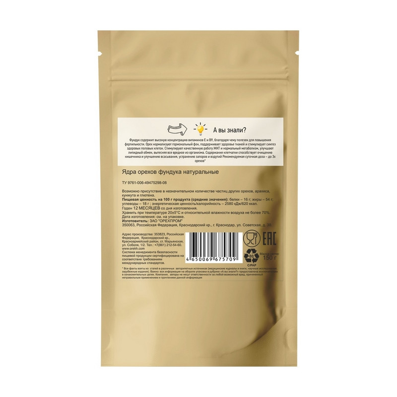 Орех фундук - один из самых любимых и часто используемых видов орехов. Фундук - орехи очень ценные, вкусные и питательные. Фундук содержит около 60% масел, которые состоят из органических кислот. Также в нем примерно 20% белка, протеин 12%, углеводы 13%, витамины В1, В2, В6, Е и целый спектр полезных минеральных веществ: калий, кальций, магний, натрий, цинк, железо. Пакет включает 150 г очищенных ядер фундука, отличающегося питательностью и высоким содержанием полезных веществ. Орехи улучшают работу головного мозга, сердечно-сосудистой системы, укрепляют мышцы и нервную систему, препятствуют образованию холестерина. Фундук разрешен к употреблению людям с сахарным диабетом. Продукт готов к употреблению. Состав: ядра орехов фундука натуральные. Пищевая ценность: белки - 16 г, жиры - 54 г, углеводы - 18 г. Энергетическая ценность: 2580 кДж/620 ккал. Хранить при температуре 20+5°C и относительной влажности воздуха не более 70%.