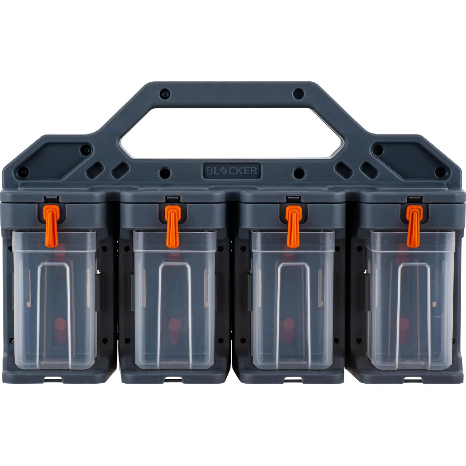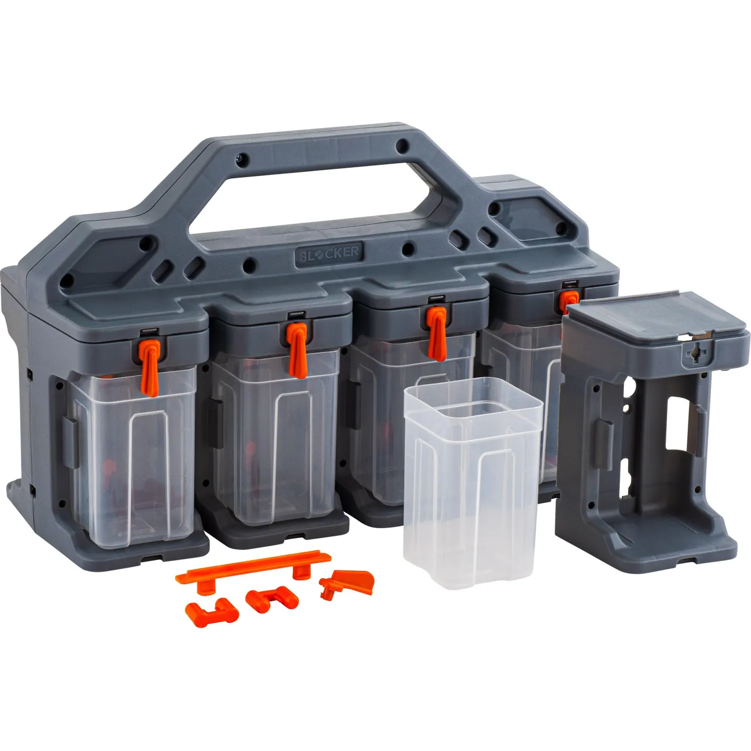 Для удобства транспортировки предусмотрена ручка. Цветовое исполнение — серый с оранжевыми элементами. Органайзер является элементом модульной системы.
