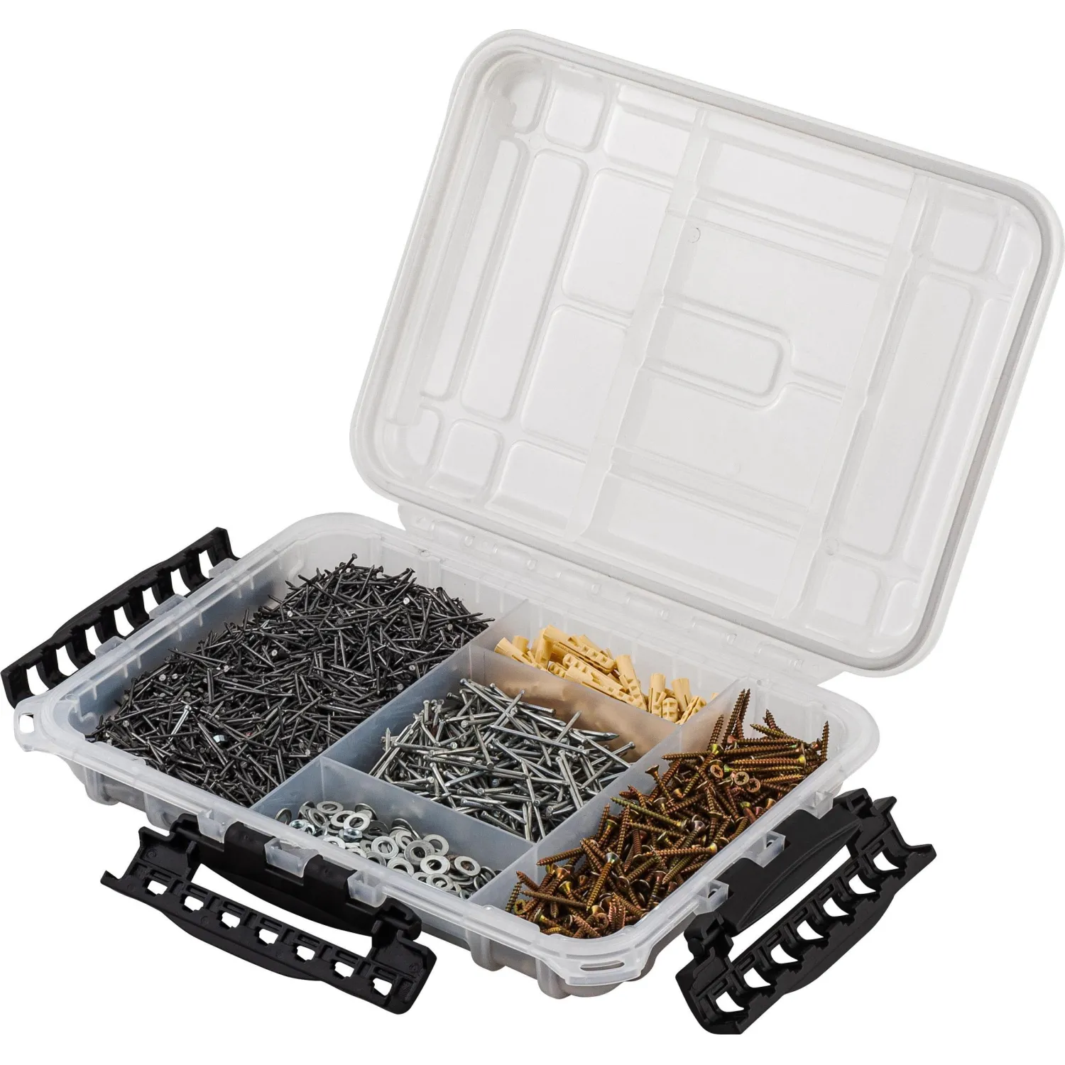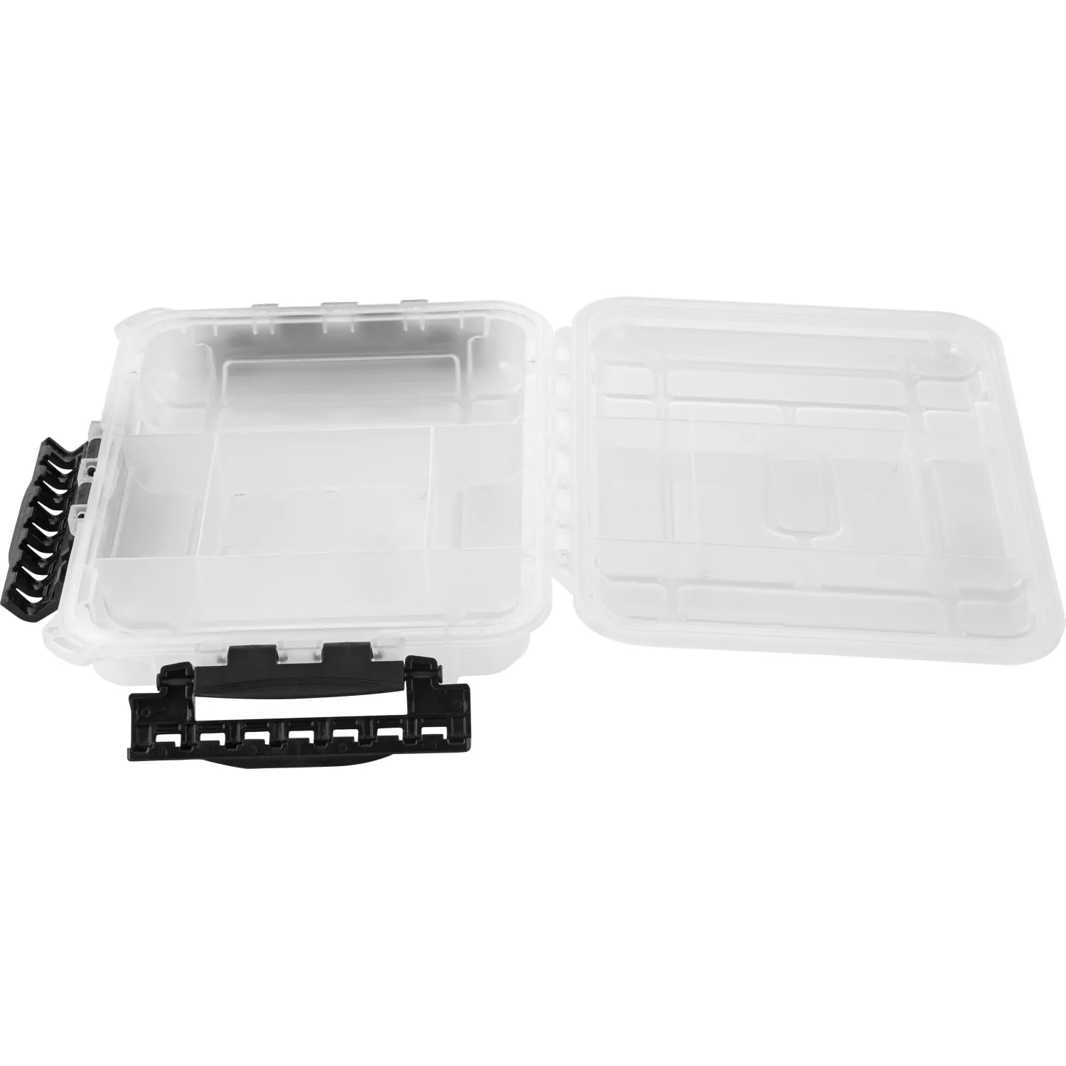 Прозрачный корпус обеспечивает визуальный контроль содержимого без открытия органайзера. Пластиковый замок плотно фиксирует крышку. Для удобства переноски предусмотрена ручка, также имеется ушко для крепления наручного шнурка. Цвет изделия — прозрачный.