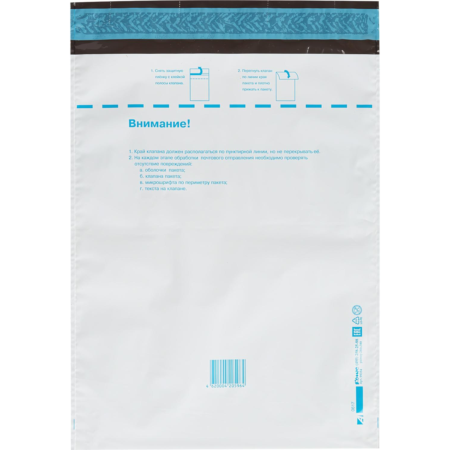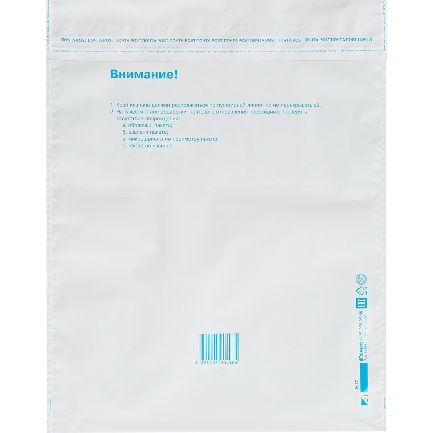 Пакет 280×380 мм изготовлен из трехслойного непрозрачного полиэтилена, имеет почтовый подсказ '