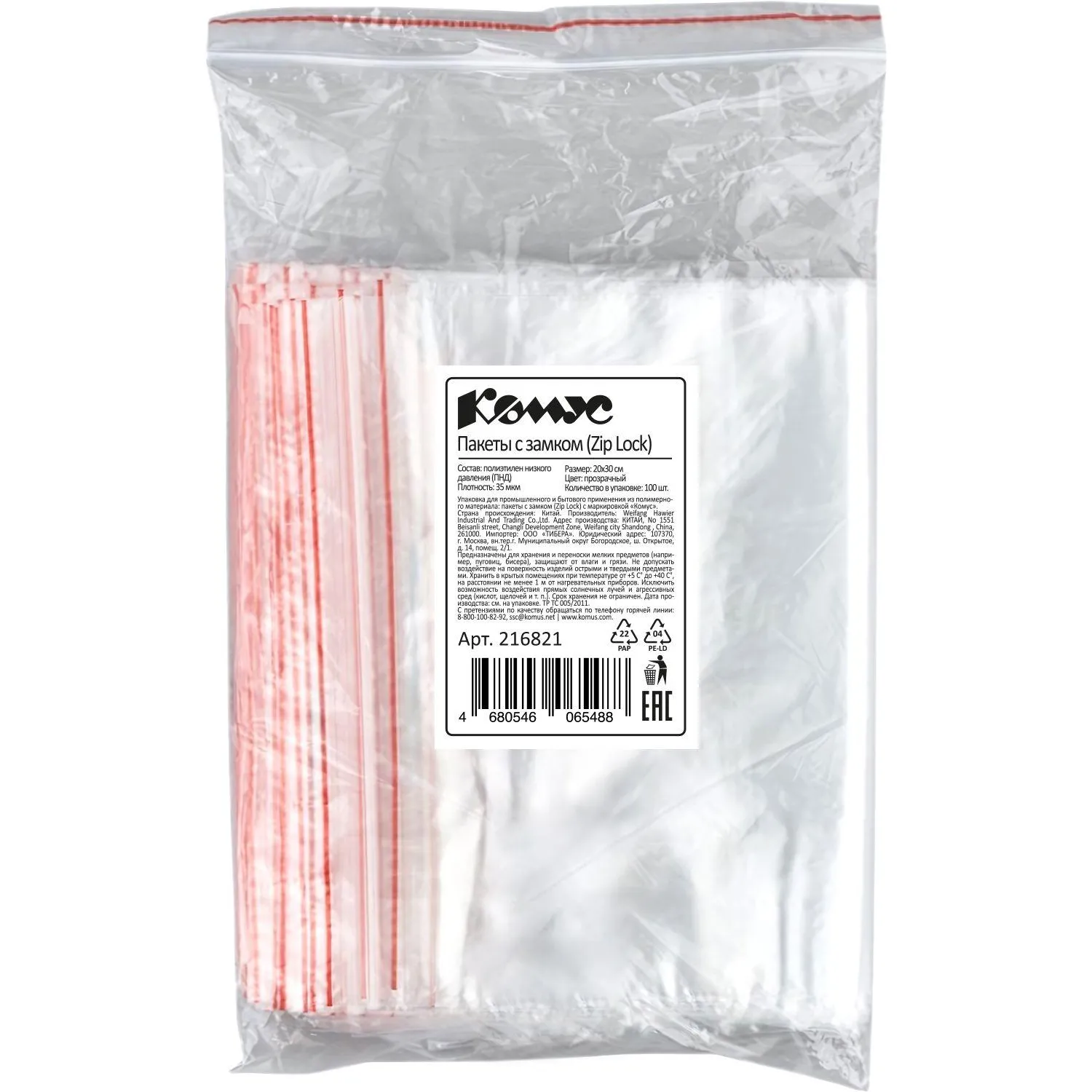 О товаре «Пакет с замком zip-lock ПВД 20x30 см 35 мкм (100 штук в упаковке)»