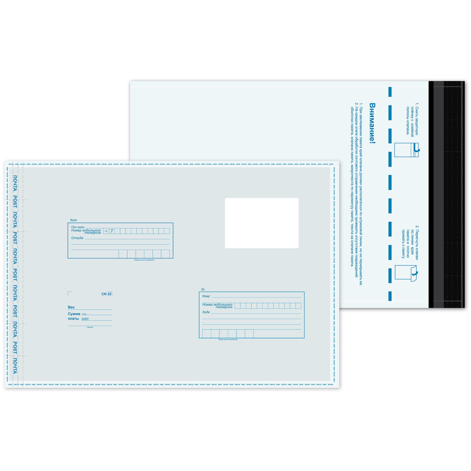 Пакет В4 (250×353 мм) из полиэтилена 70 мкм стрип (500 штук в упаковке). Оснащен почтовым подсказом ’Куда-Кому’ и отрывной клейкой лентой. Благодаря специальному прочному шву с микротекстом и специальным линиям просечек с защитным текстом на клапане предотвращает несанкционированное вскрытие. Имеет зону для нанесения шариковой ручкой надписей, оттисков штемпелей и не допускают их истирания при обработке и транспортировке. Многослойный полиэтилен защищает вложение от влаги и механических повреждений, непрозрачность исключает возможность определить содержимое. Предназначен для пересылки всех видов почтовых отправлений — писем, бандеролей и других видов отправлений.
