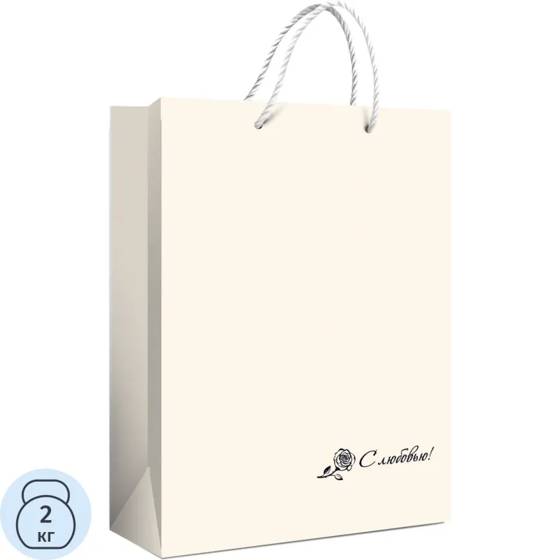 Пакет оформлен в белом цвете с надписью «С любовью» и подойдёт для подарков к любому случаю. Производится в России.