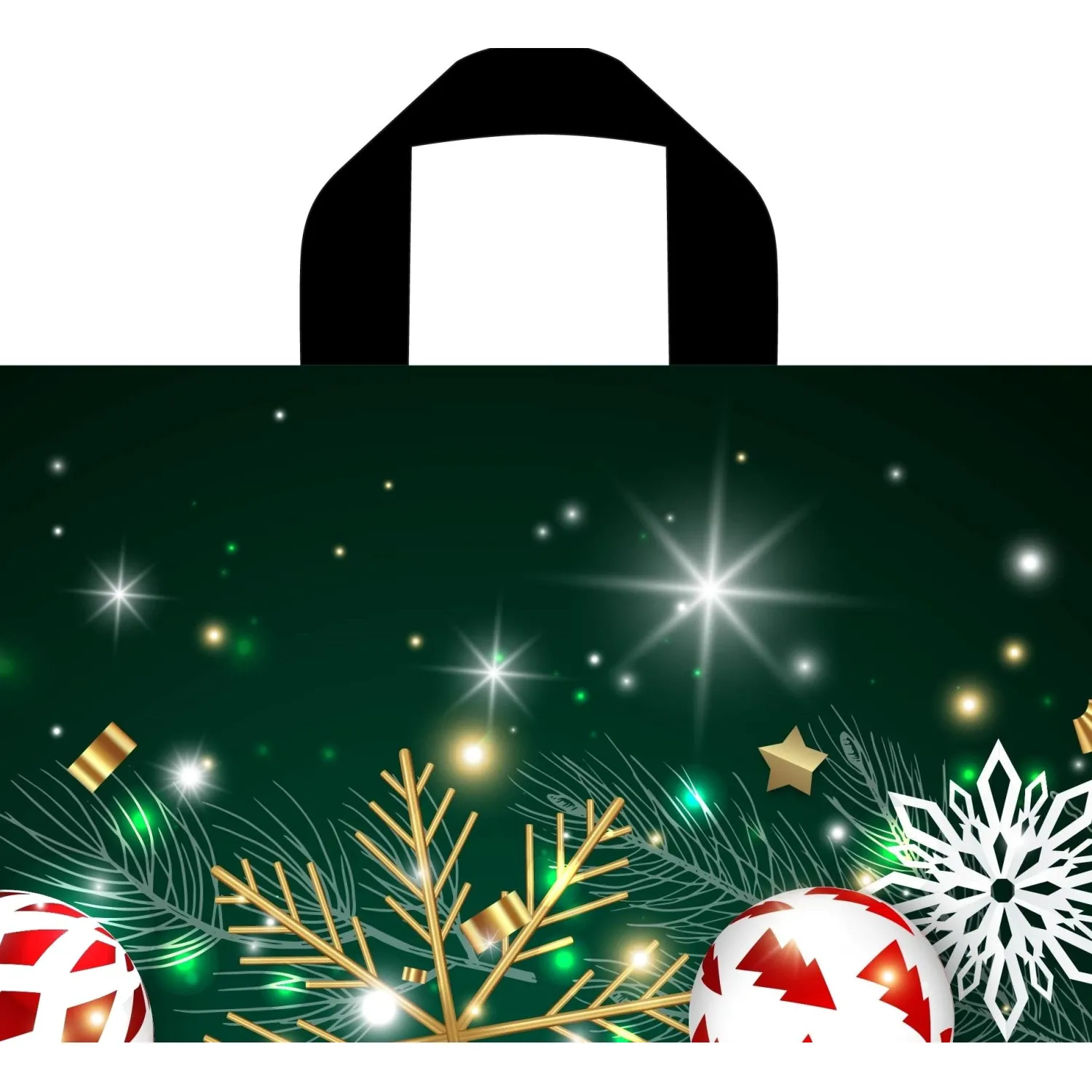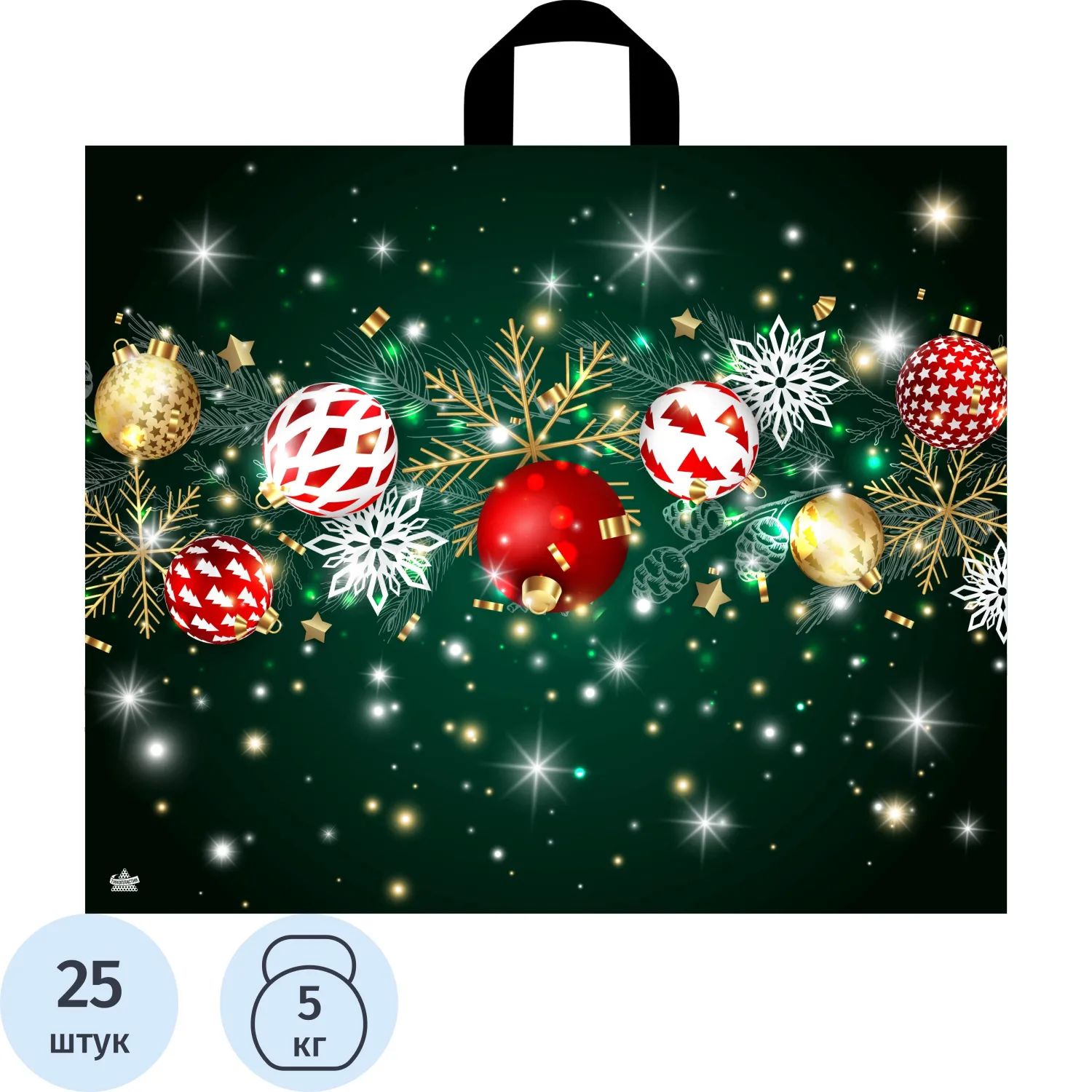 Подарочный пакет «Новогоднее мерцание» с петлевыми ручками создаст атмосферу праздника для ваших подарков. Его тёмно-зелёный фон с узором из разноцветных ёлочных игрушек в красных, белых и золотых тонах дополнен эффектом мерцания. Вместительный размер 50×60×1 см позволяет упаковать подарки разного формата, а прочные петлевые ручки обеспечивают удобную переноску. Пакет выдерживает вес до 5 кг и обладает плотностью 60 мкм. Упаковка включает 25 штук.