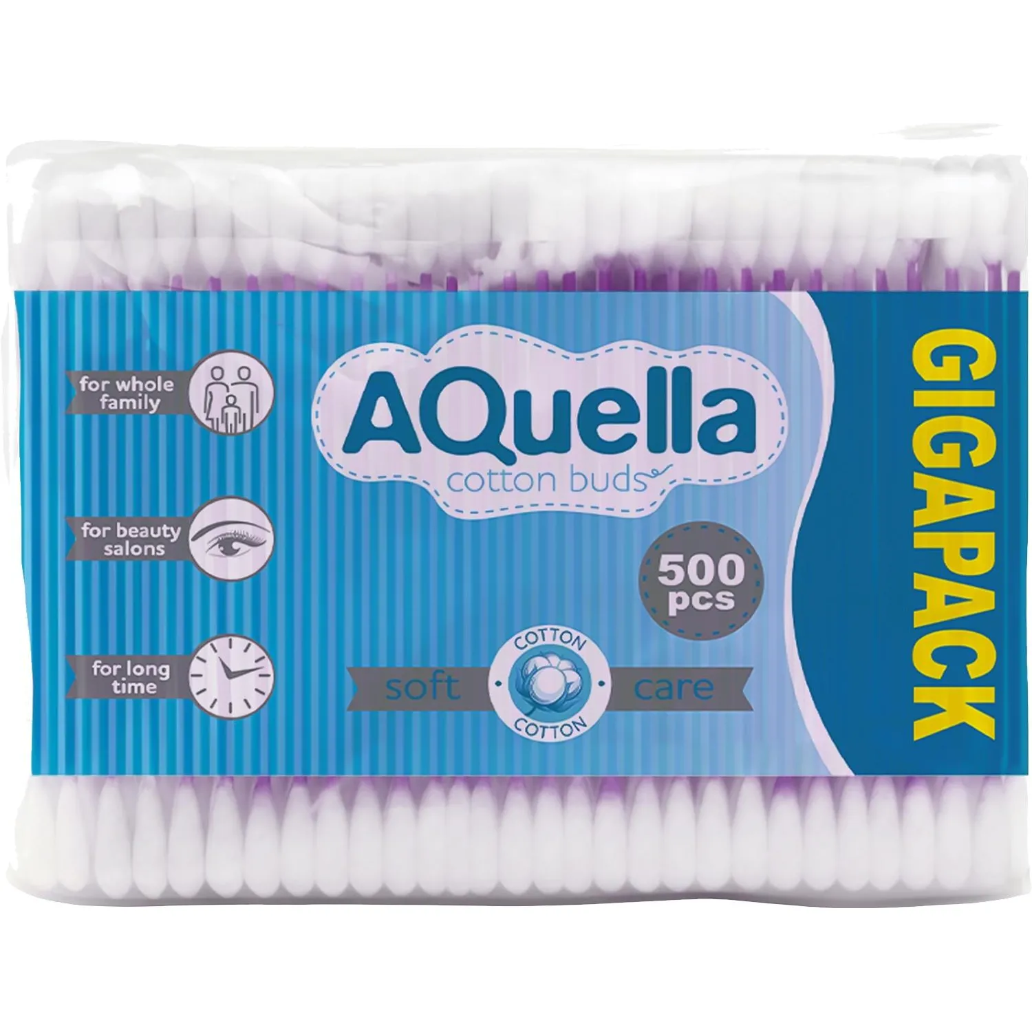 Ватные палочки гигиенические косметические ушные Aquella cotton buds 500 шт. Изготовлены из натурального хлопка, отбелённого без хлора, прекрасно впитывают влагу, предназначены для очищения и удаления влаги в складках кожи новорождённых младенцев, между пальцами, в области ушей и носа, а также для корректировки макияжа. Такие одноразовые палочки для очищения идеально подойдут для использования и взрослым, и детям. Ватные палочки могут применяться для рисования, удаления лака с ногтей и кутикулы во время маникюра и педикюра.