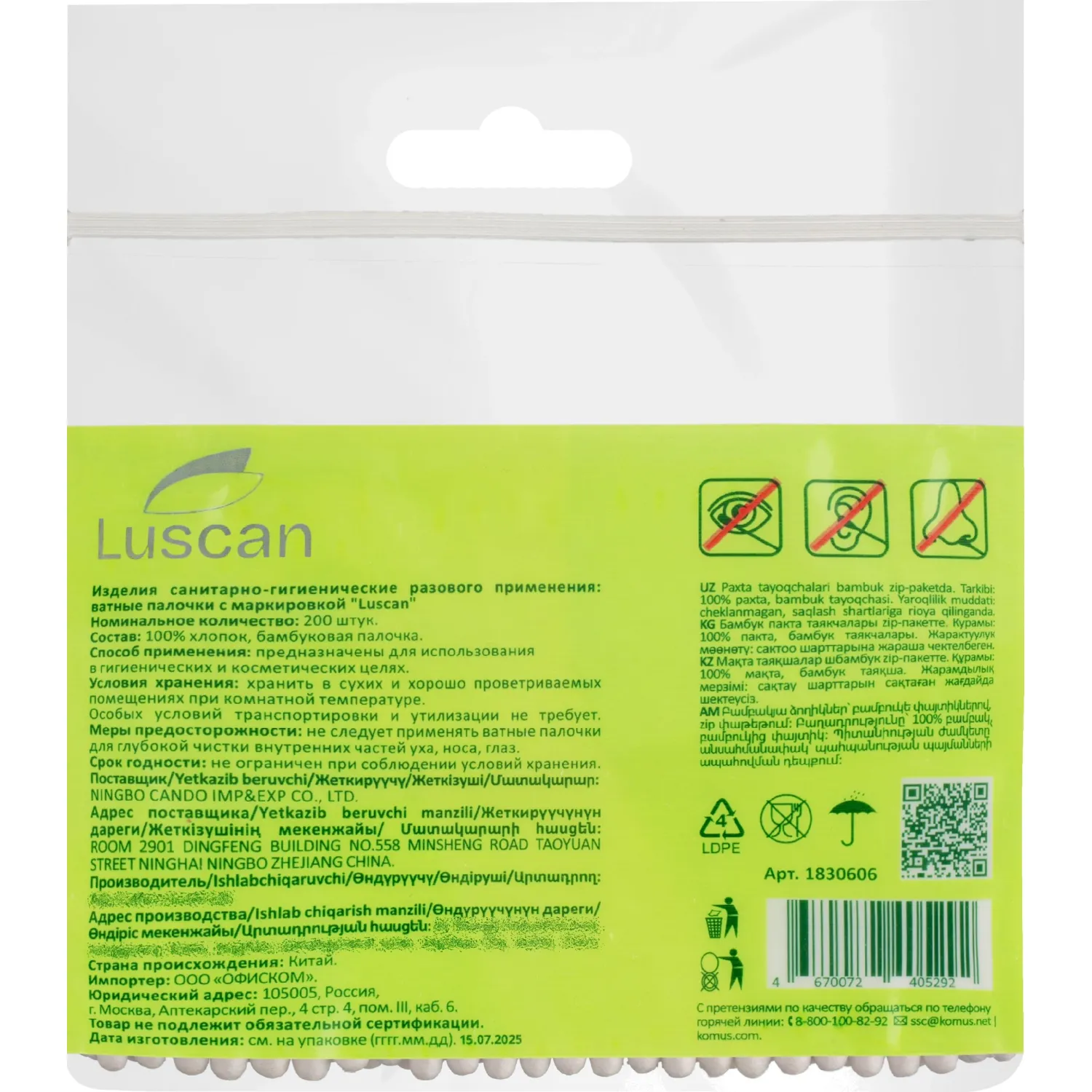 Ватные палочки Luscan — неотъемлемый аксессуар для косметических, гигенических процедур, макияжа. Ватные палочки изготовлены из натуральных материалов: палочка из бамбука, а наконечник — 100% хлопок.