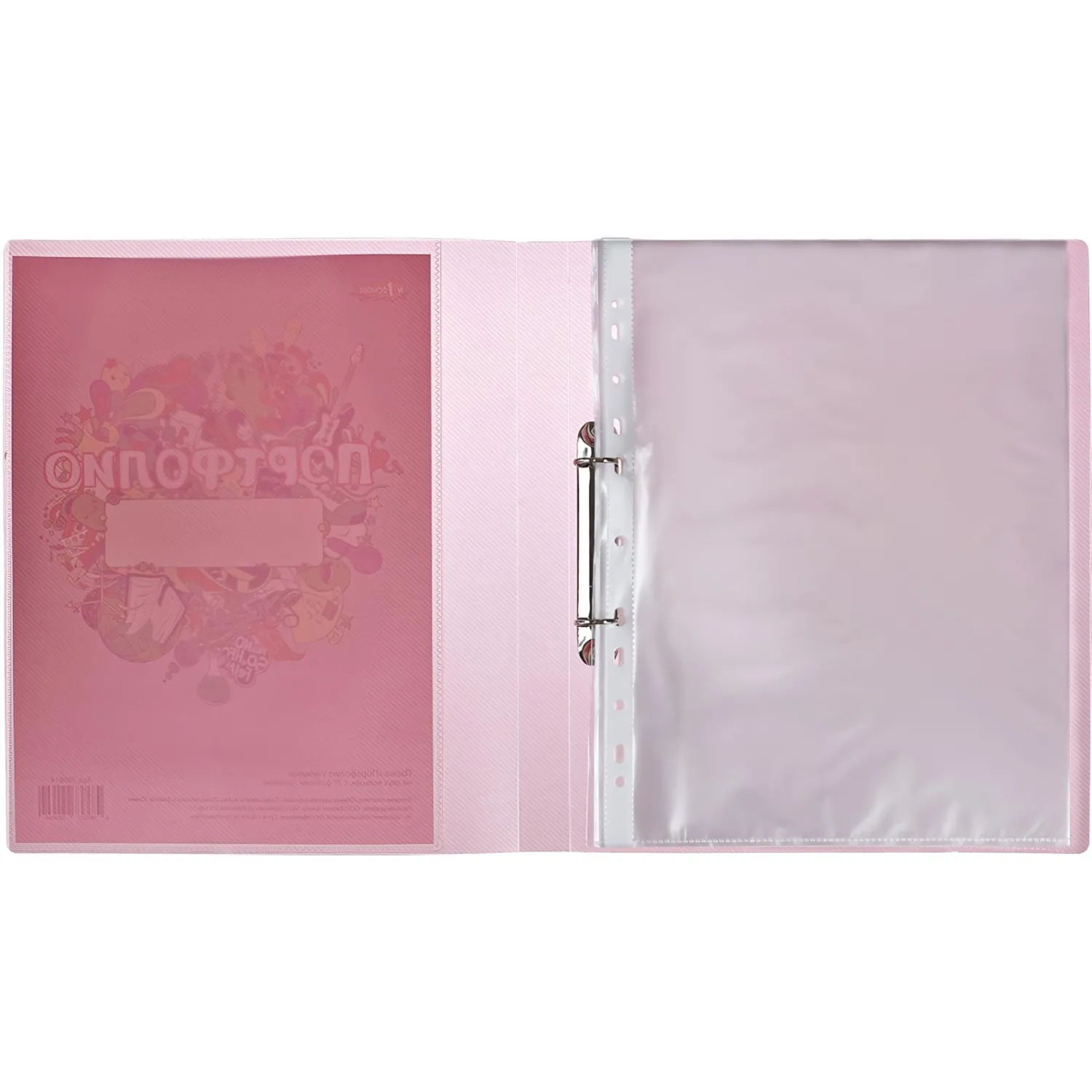 Портфолио — это сборник достижений школьника, который необходим для демонстрации его успехов. Оно позволит собрать и систематизировать полезную информацию об учебных и внеучебных достижениях ребёнка, урочных и внеурочных результатах его деятельности. Папка-портфолио изготовлена из высококачественного полипропилена, цвет розовый, формат — А4. Снабжена механизмом на двух кольцах, благодаря которому ребёнок легко сможет пополнять свой портфель достижений по мере необходимости. В папке есть 20 файлов. Фактура пластика — диагональ. Фурнитура — 2 кольца, диаметр — 20 мм. Верхняя обложка с карманом. Есть возможность заменить картинку на обложке.