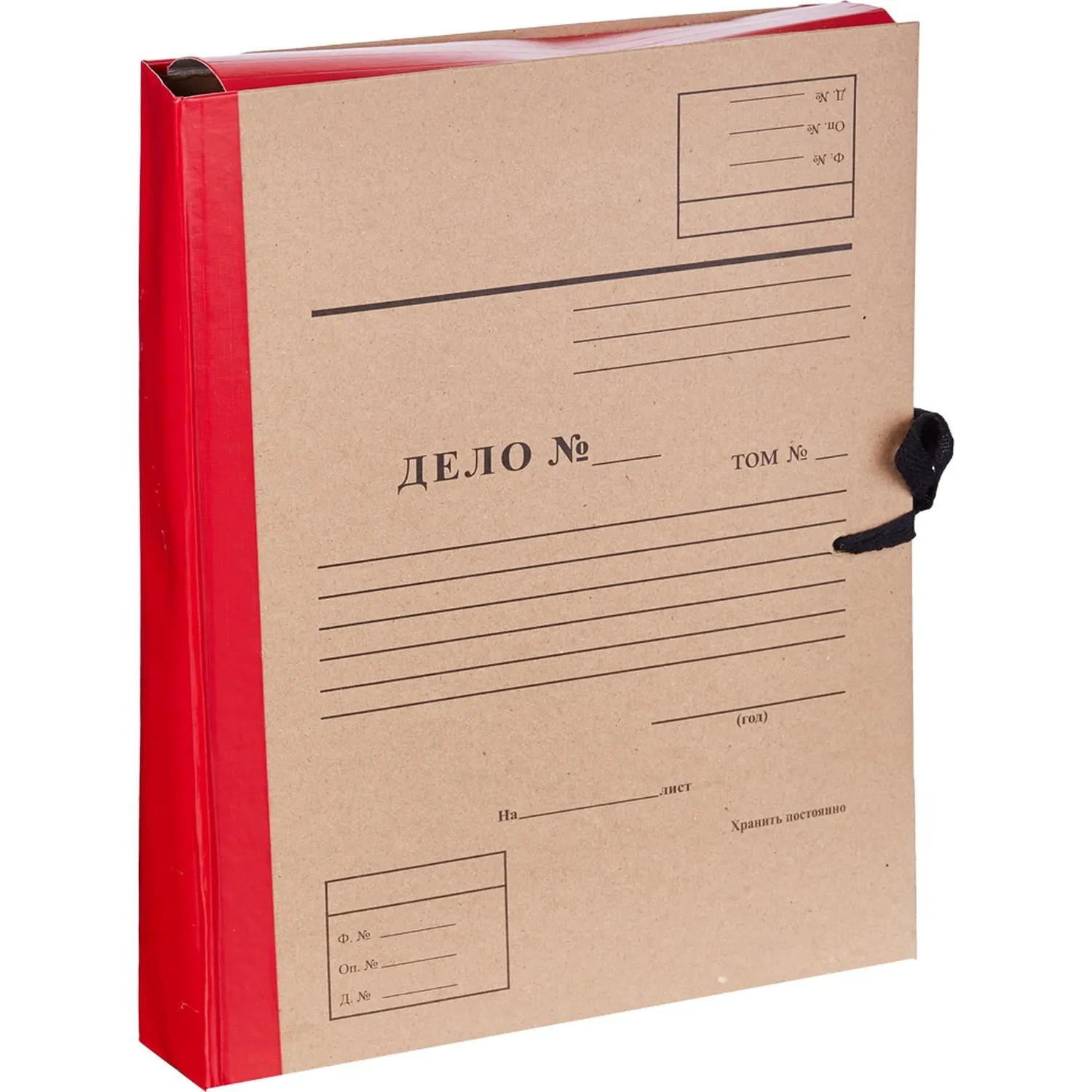 Архивная папка ’Дело №’ формата А4 выполнена из плотного картона, обтянутого крафт-бумагой красного цвета. Корешок шириной 50 мм — из бумвинила (слой ПВХ на бумажной основе). В закрытом виде фиксируется с помощью четырех завязок. Вмещает до 500 листов стандартной плотности. Размер изделия — 310×50×230 мм.