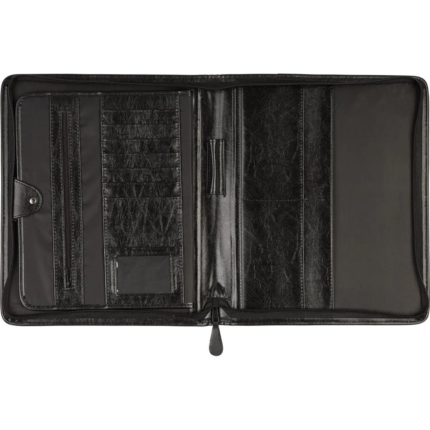 Папка Навигатор 108и на молнии, с выдвижными ручками, VIP-серия. Размер 360х300х50 мм. Материал - заменитель кожи, цвет черный. Папка на молнии с выдвигающимися ручками, благодаря которым можно использовать папку как портфель. Имеет два накладных кармана, внутреннее отделение, застегивающееся на кнопку, держатель для ручки и много кармашков разного размера.