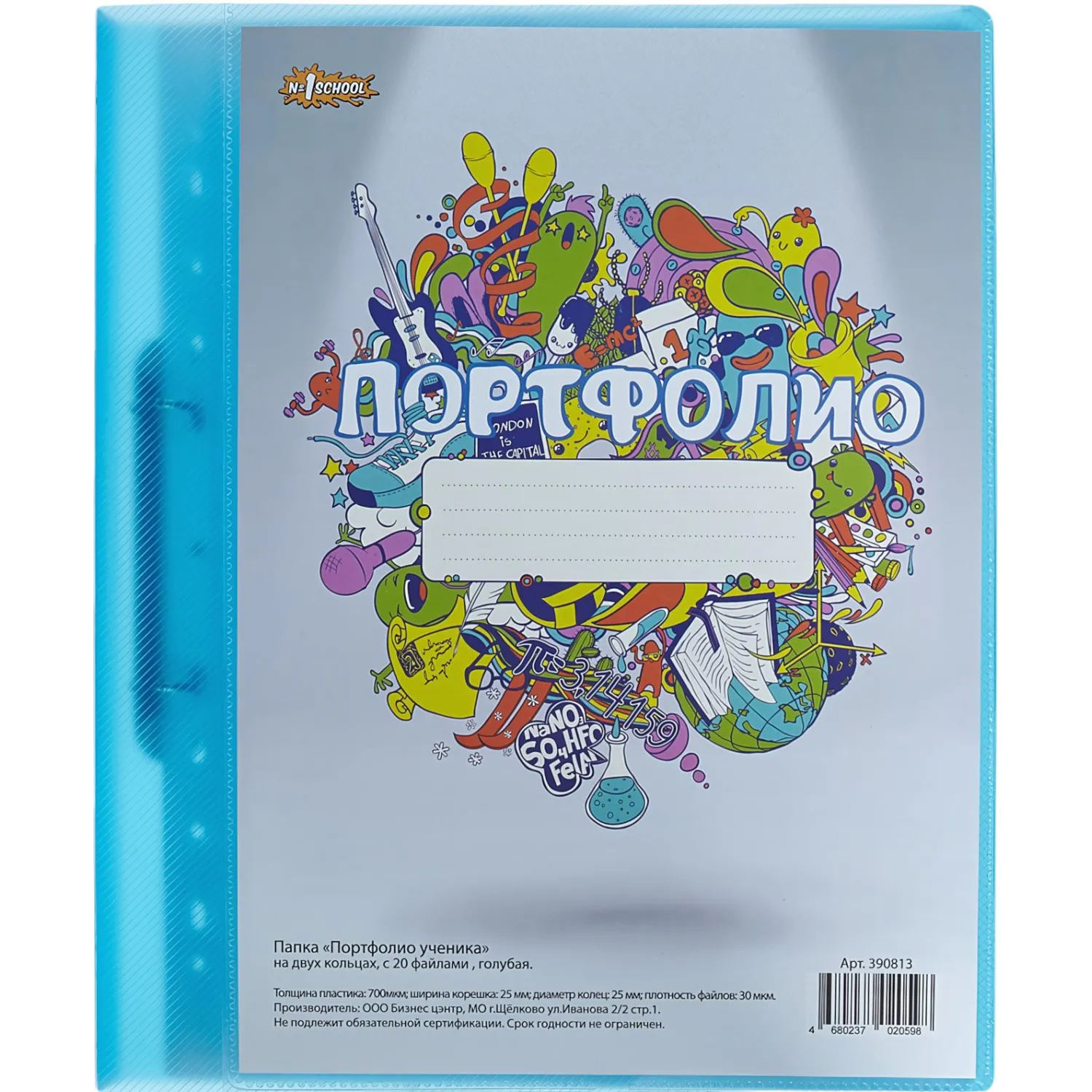 Портфолио — это сборник достижений школьника, который необходим для демонстрации его успехов. Оно позволит собрать и систематизировать полезную информацию об учебных и внеучебных достижениях ребёнка, урочных и внеурочных результатах его деятельности. Папка снабжена механизмом на двух кольцах, благодаря которому ребёнок легко сможет пополнять свой портфель достижений по мере необходимости. В папке есть 20 файлов. Фактура пластика — диагональ. Фурнитура — 2 кольца, диаметр — 20 мм. Есть возможность заменить картинку на обложке.