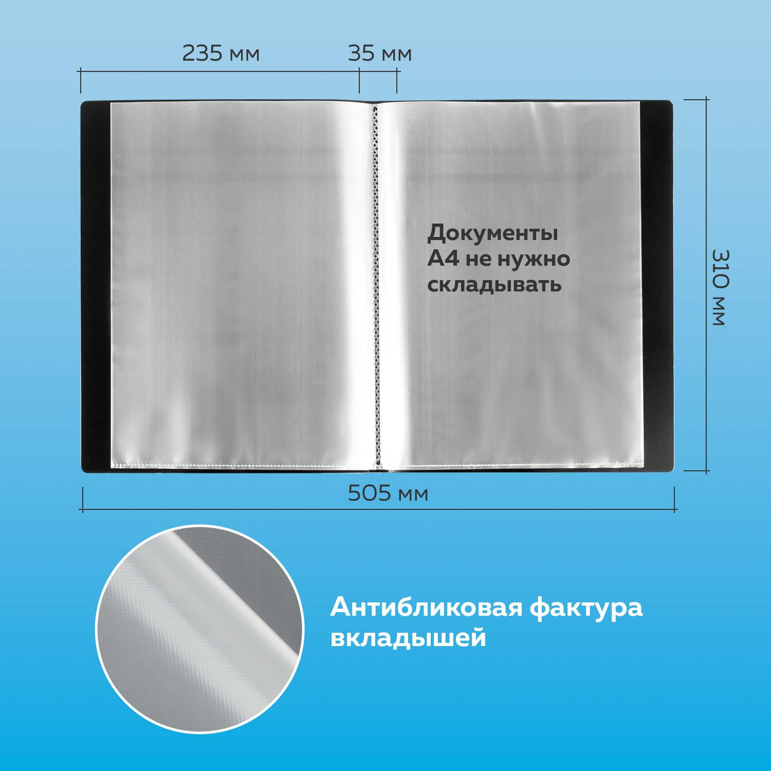 На корешке имеется карман для маркировки содержимого. Папка изготовлена из качественного пластика толщиной 0,9 мм с антибликовой фактурой, а ширина корешка составляет 35 мм. Содержит 100 вкладышей, позволяющих хранить документы формата А4 и обеспечивающих их надежную защиту от попадания влаги, пыли и прочих повреждений. Поставляется в индивидуальной упаковке.