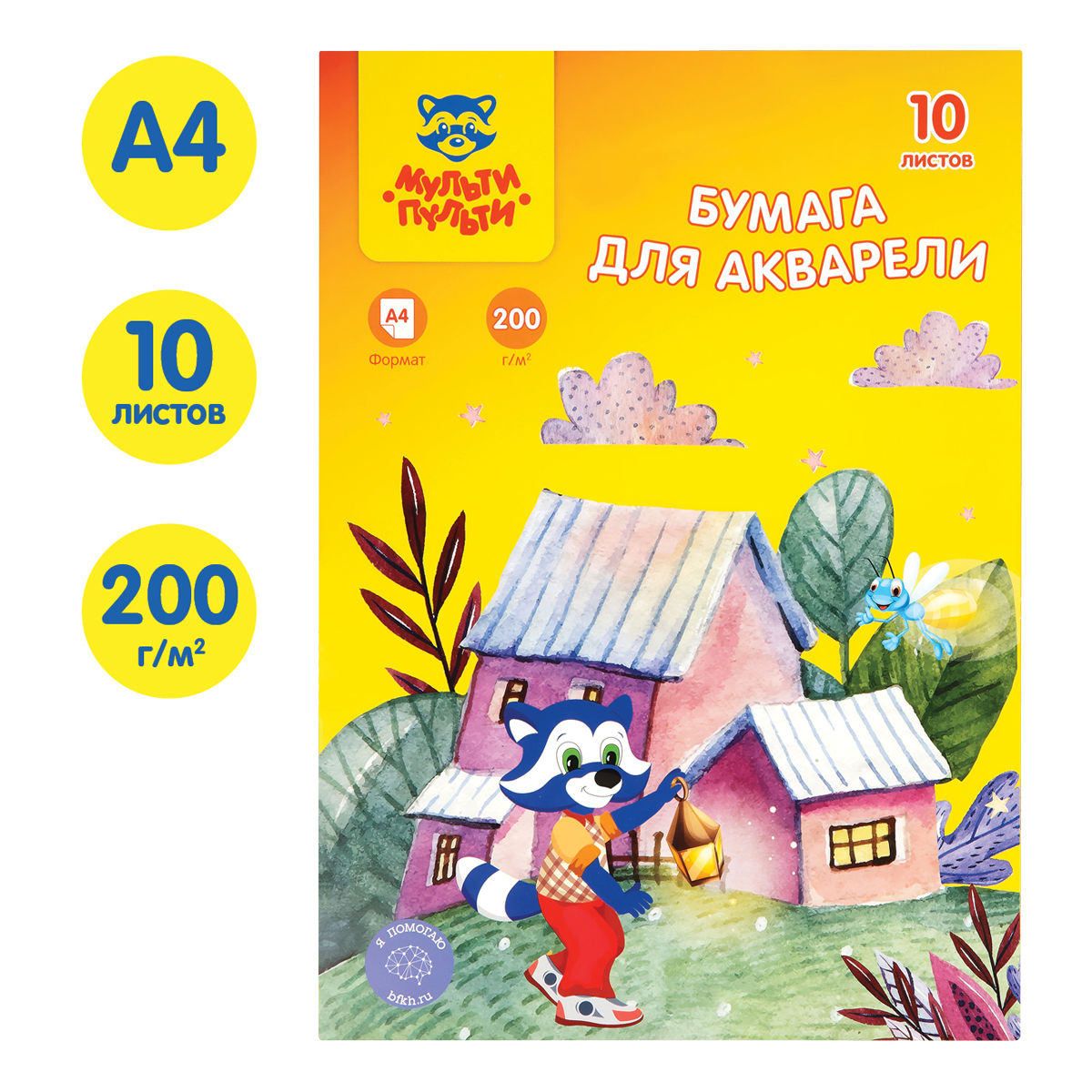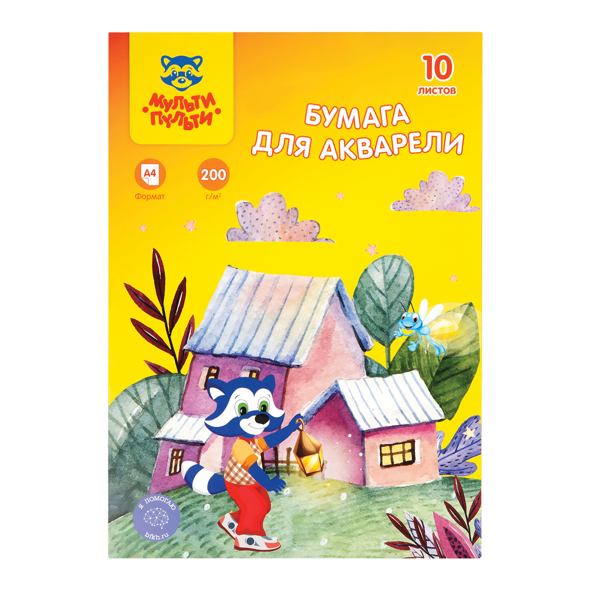 Папка для рисования акварелью «Мульти-Пульти» серия «Енот в Волшебном мире» из мелованного картона с внутренним блоком из рисовальной бумаги формата А4 размером 297*210 мм, плотностью 200 гр/м2. Количество листов в упаковке – 10 штук.