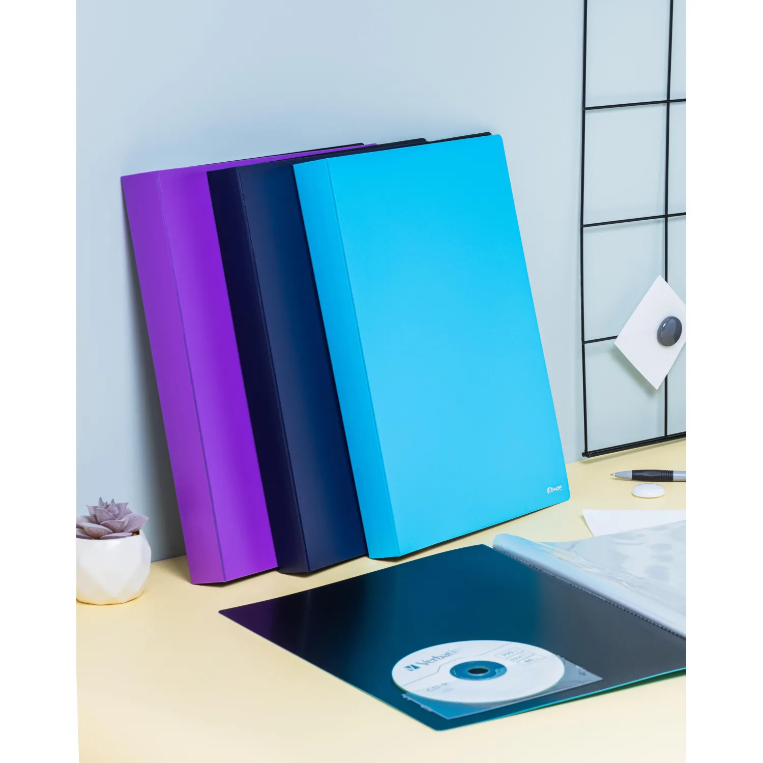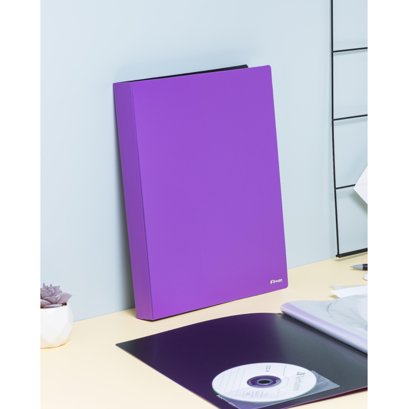 Папка с файлами Комус формата А4 изготовлена из полипропилена толщиной 0,5 мм двух цветов: сиреневого (внешняя поверхность) и черного (внутренняя поверхность). Имеет 40 несъемных прозрачных вкладышей для удобного хранения и демонстрации документов. В каждом из них можно разместить по два листа. Ширина корешка составляет 20 мм. Файловая папка дополнительно оснащена внутренним карманом для компакт-дисков и визитных карточек. Плотность файлов 30 мкм.