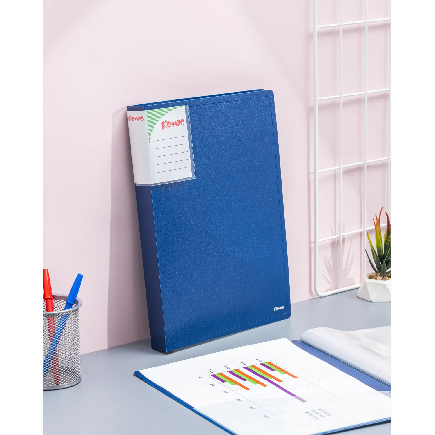 Папка с файлами Комус из коллекции ’Шелк’ выполнена из пластика синего цвета толщиной 0,9 мм. Имеет 80 прозрачных файлов для хранения и демонстрации документов. На корешке предусмотрен прозрачный карман с вкладышем для маркировки, на внутренней стороне створки — дополнительный карман для записок, сим-карт, компакт-дисков. Файловая папка вмещает до 160 листов формата А4. Плотность файлов 35 мкм.