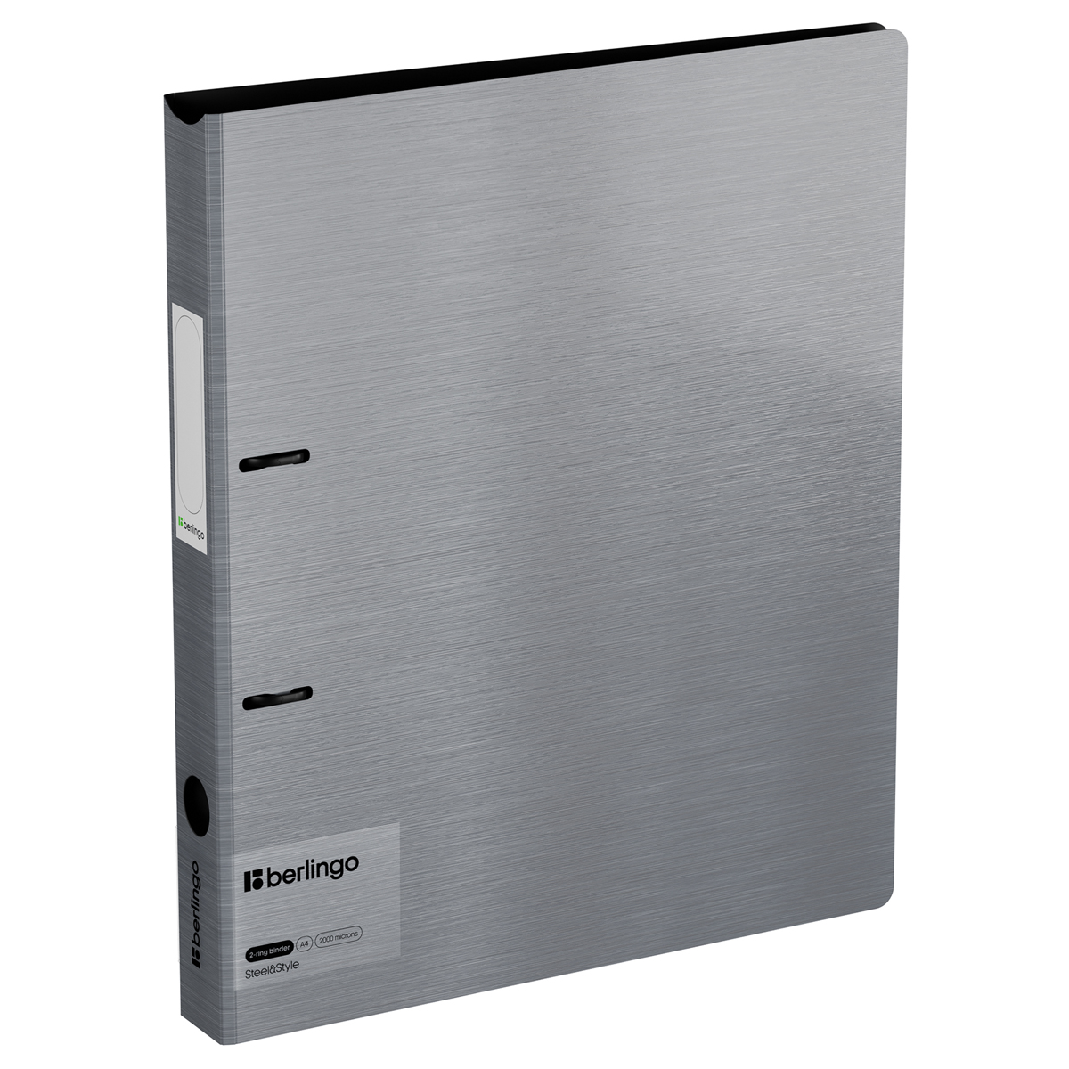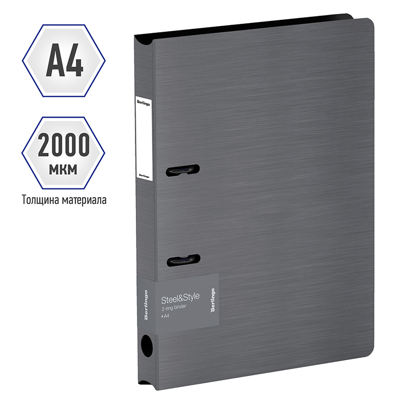 Папка на 2-х кольцах Berlingo серии Steel&Style формата А4 - замечательный аксессуар для офиса и учёбы, выполненный в классическом офисном стиле. Увеличенная толщина обложки из полифома - 2000 мкм. Внешняя сторона в цвете серебристый металлик в сочетании с фактурой "сталь", а также чёрный цвет внутренней поверхности. Ширина корешка составляет 35 мм. Специальная D-форма колец помогает удобно и ровно хранить документы, которые могут быть выровнены по левому краю, благодаря боковой вертикальной стенке кольца. Кольца диаметром 25 мм и фурнитура тоже выполнены в чёрном цвете. Вместимость папки – 200 листов. Специальные формовые отверстия в обложке служат для надежного защелкивания папки в сложенном виде, предотвращают случайное открытие обложки и замятие документов внутри при хранении и транспортировке. Специальная наклейка на корешке, позволяющая делать пометки о содержимом, в комплекте есть дополнительная наклейка. Папка может использоваться как регистратор и устойчиво храниться в вертикальном положении. Эргономичная круглая вырубка в корешке для быстрого извлечения папки из хранилища. Размер папки составляет 310*260*35 мм. Упакована в индивидуальный пакет с липким краем.
