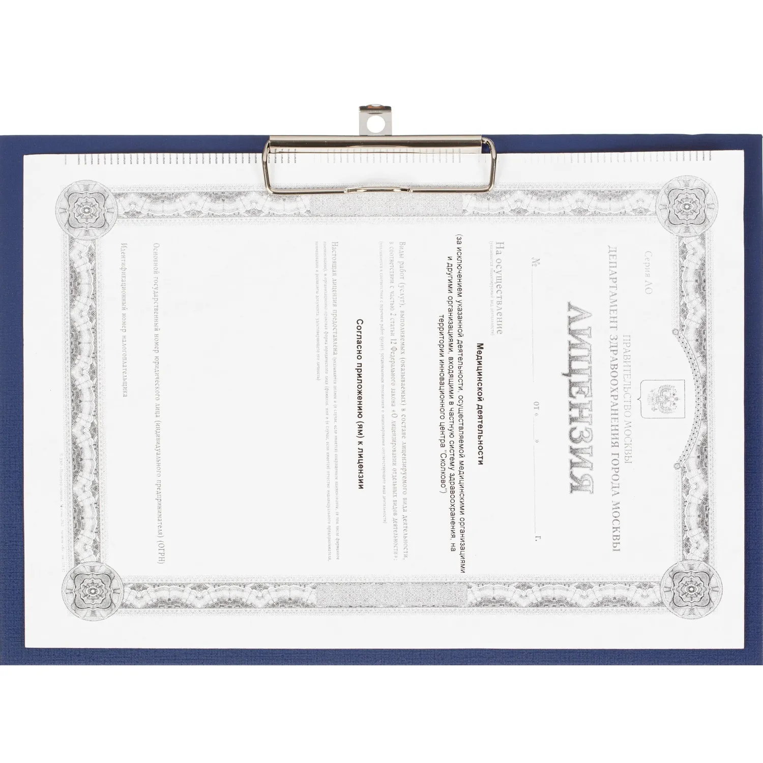 Папка-планшет изготовлена из плотного картона, покрытого бумвинилом синего цвета. Формат А4. Горизонтально ориентирована. Есть возможность крепления планшета к стене.