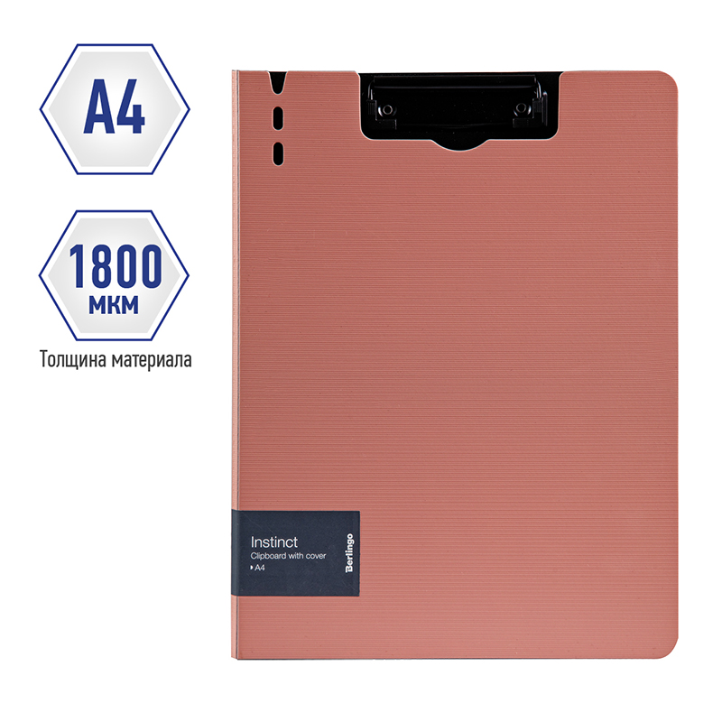 Папка-планшет с зажимом Berlingo серии Instinct размером 320*225 мм изготовлена из плотного пластика (полифом) толщиной 1,8 мм. Вместимость папки – 100 листов, ширина корешка – 10 мм. Насыщенный пастельный розовый цвет внешней стороны в сочетании с фактурой "горизонтальные линии", черный цвет внутренней поверхности с прижимом. Металлический зажим для фиксации документов. Вырубки на крышке позволяют легко закрепить ручку на папке. Позволяет делать записи на весу. Индивидуальная упаковка в пакет.