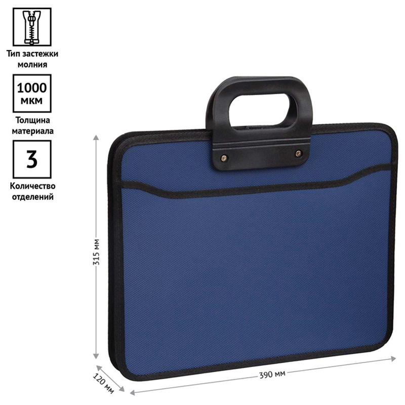 О товаре «Папка-портфель 3 отделения OfficeSpace А4+, 390*315*120мм, 1000мкм, на молнии (сверху), пластик, синий»